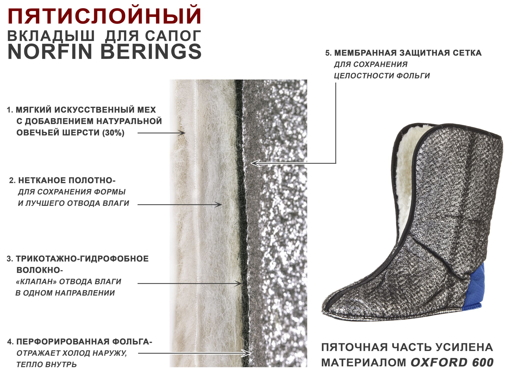 — Металлизированная перфорированная фольга – отражает холод наружу, а тепло к ноге.