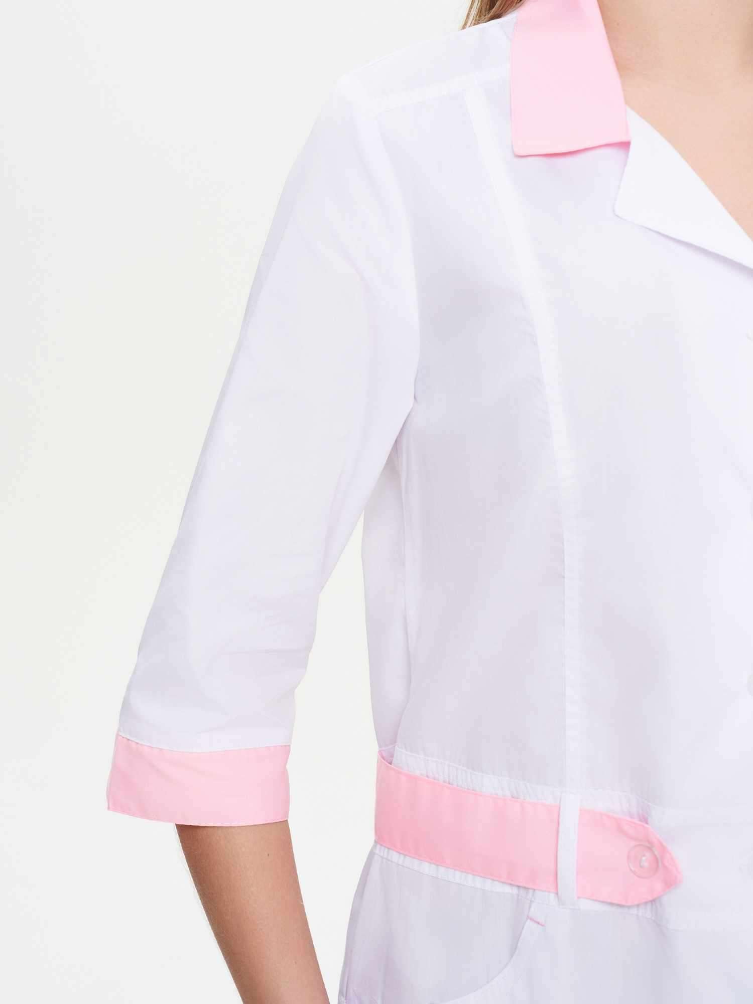 - Воротник, манжеты рукава и съемный пояс из отделочной ткани розового цвета.