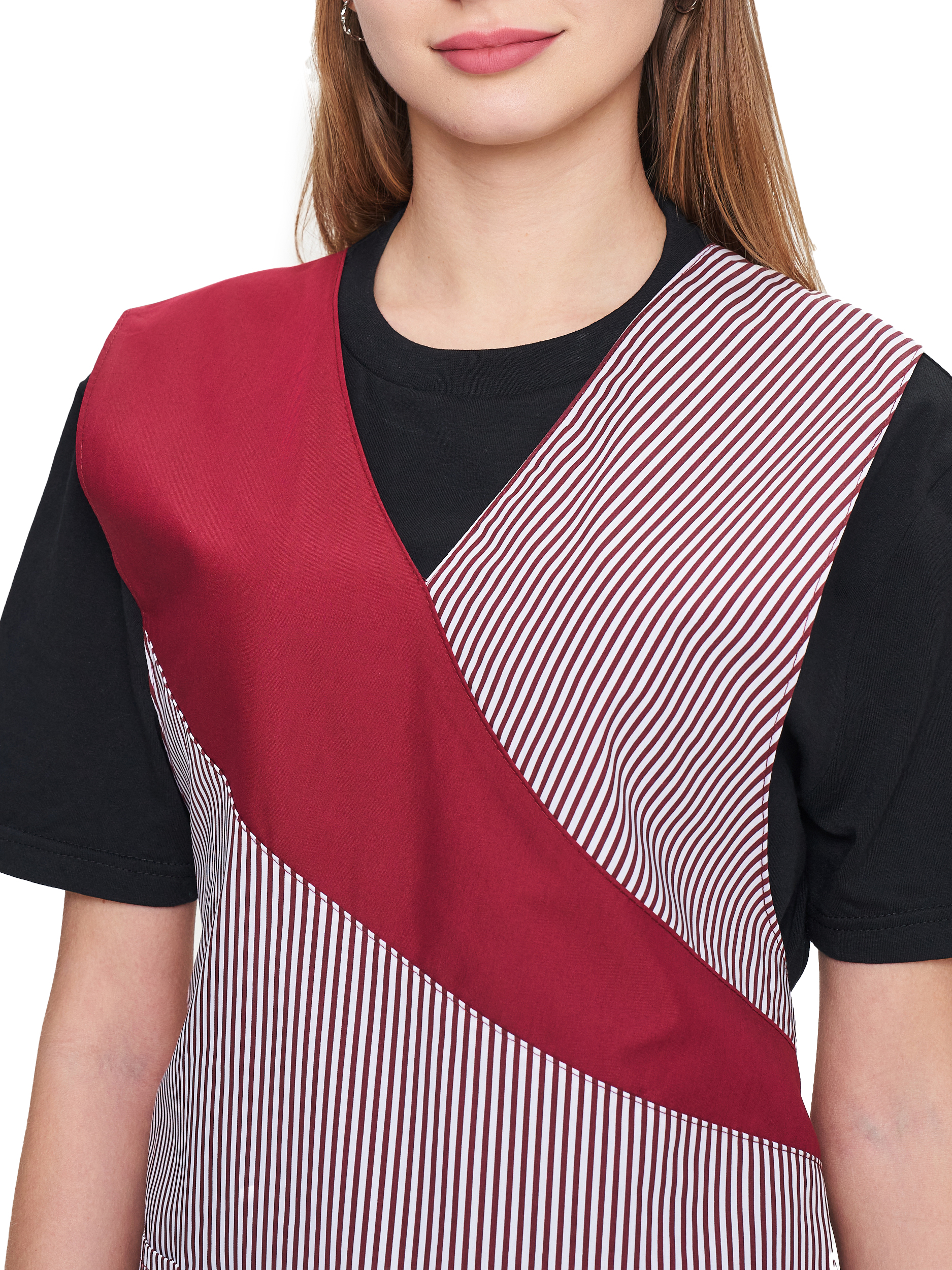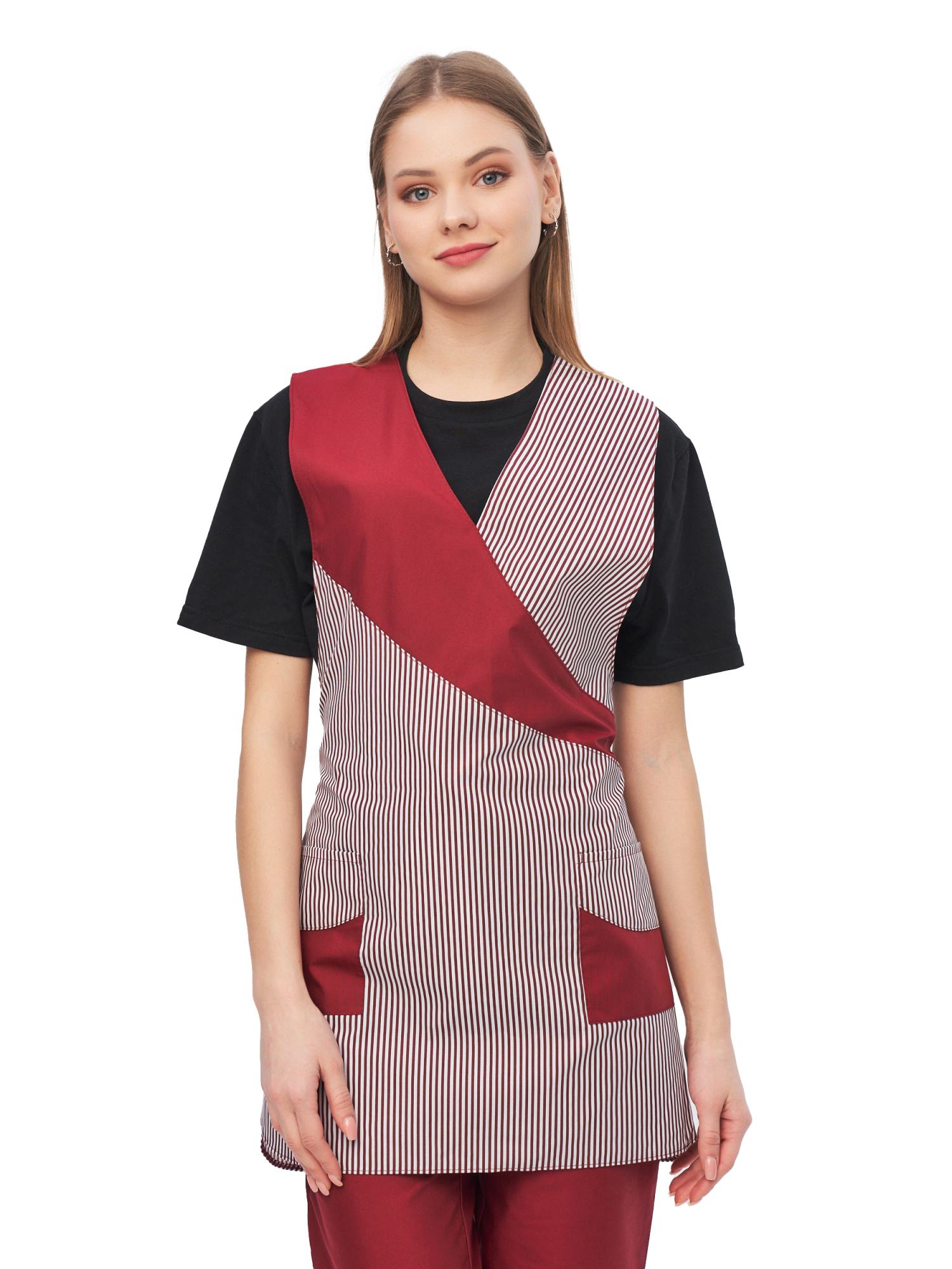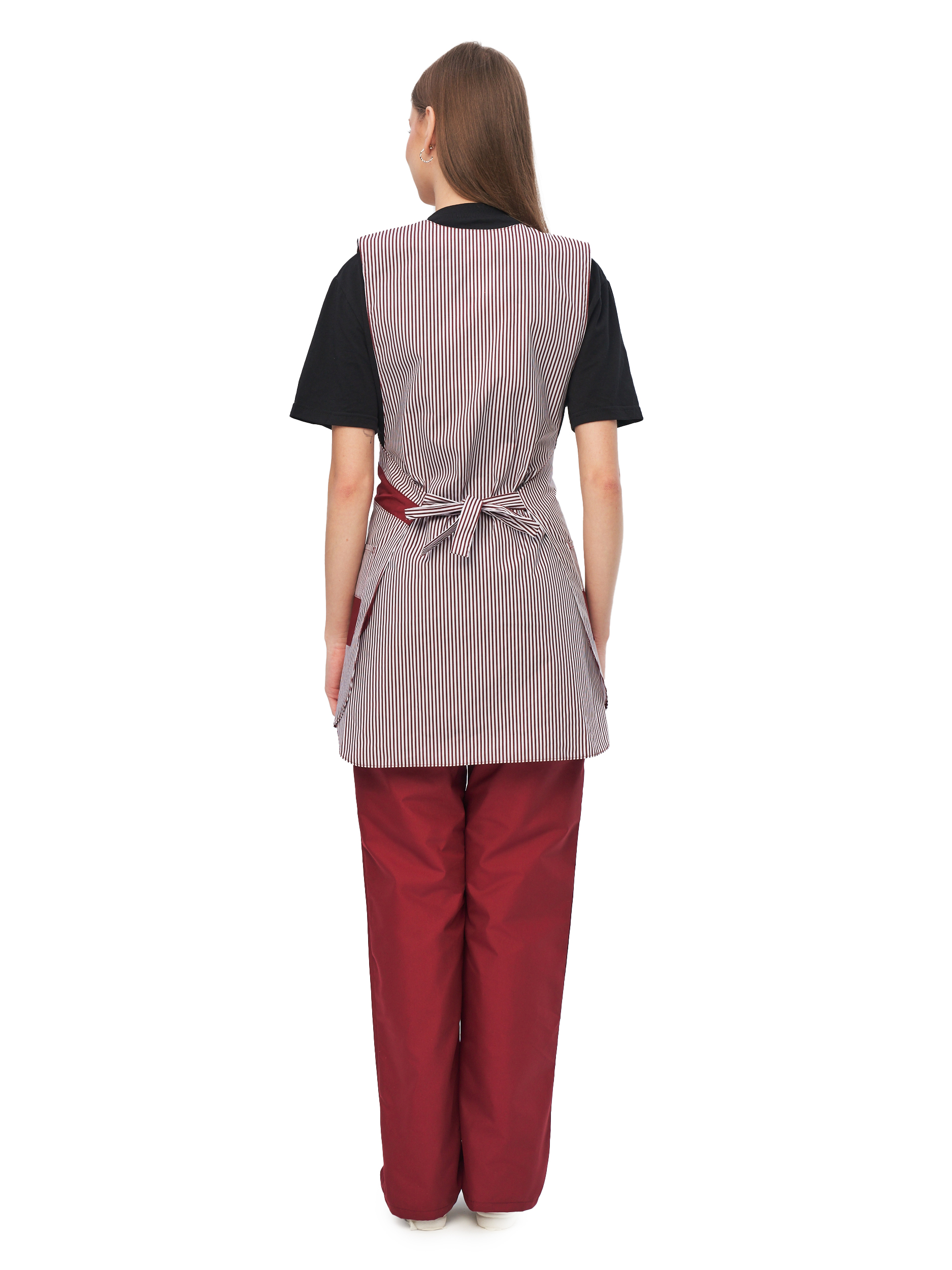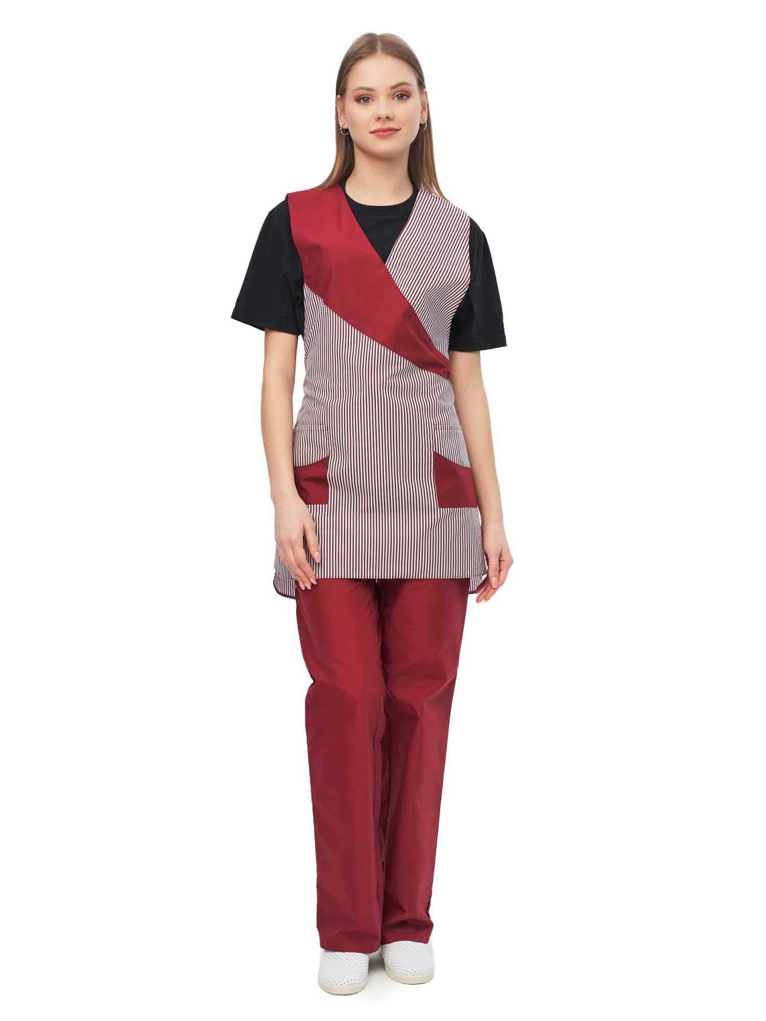 Современный удобный женский комплект со свободной посадкой, рекомендован для сферы обслуживания, клининга, гостиничного бизнеса (HORECA) из высококачественной смесовой ткани убережет от загрязнений и послужит отличным помощником в решении задач любой сложности. Комплект для горничных и уборщиц прост в уходе, не мнется и быстро сохнет, а материал долгое время сохранит свой первоначальный яркий цвет. Комплект женский "София" состоит из фартука-сарафана бело-бордового цвета и брюк бордового цвета. Спецодежда для горничных является особенным видом профессиональной униформы. Она создана для сферы обслуживания, работники которой всегда должны выглядеть безупречно. Одежда для горничных строго регламентируется администрацией гостиницы или отеля, поэтому ее состоянию уделяется большое внимание. Костюм состоит из прочной смесовой ткани ТИСИ, отталкивающей различного рода загрязнения. Материал устойчив к пятнам и истиранию, тем самым уборщицы всегда будут выглядеть опрятно и привлекательно.