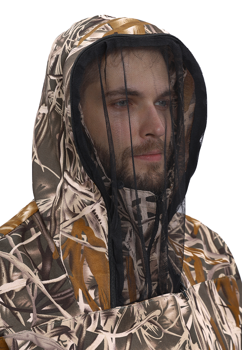 Куртка, прямого силуэта, с застежкой на молнию в верхней части, с объемным капюшоном и противомоскитной сеткой;