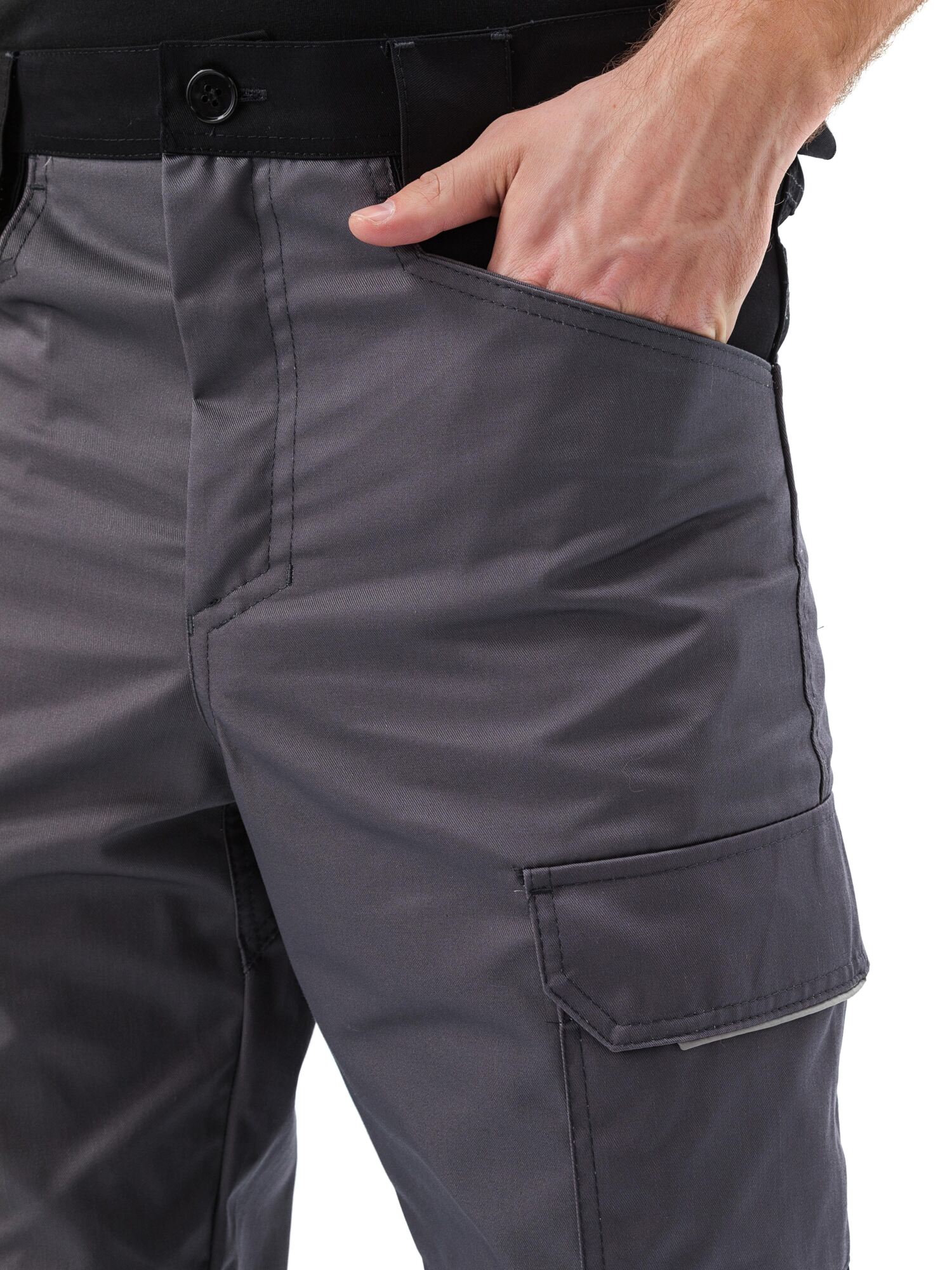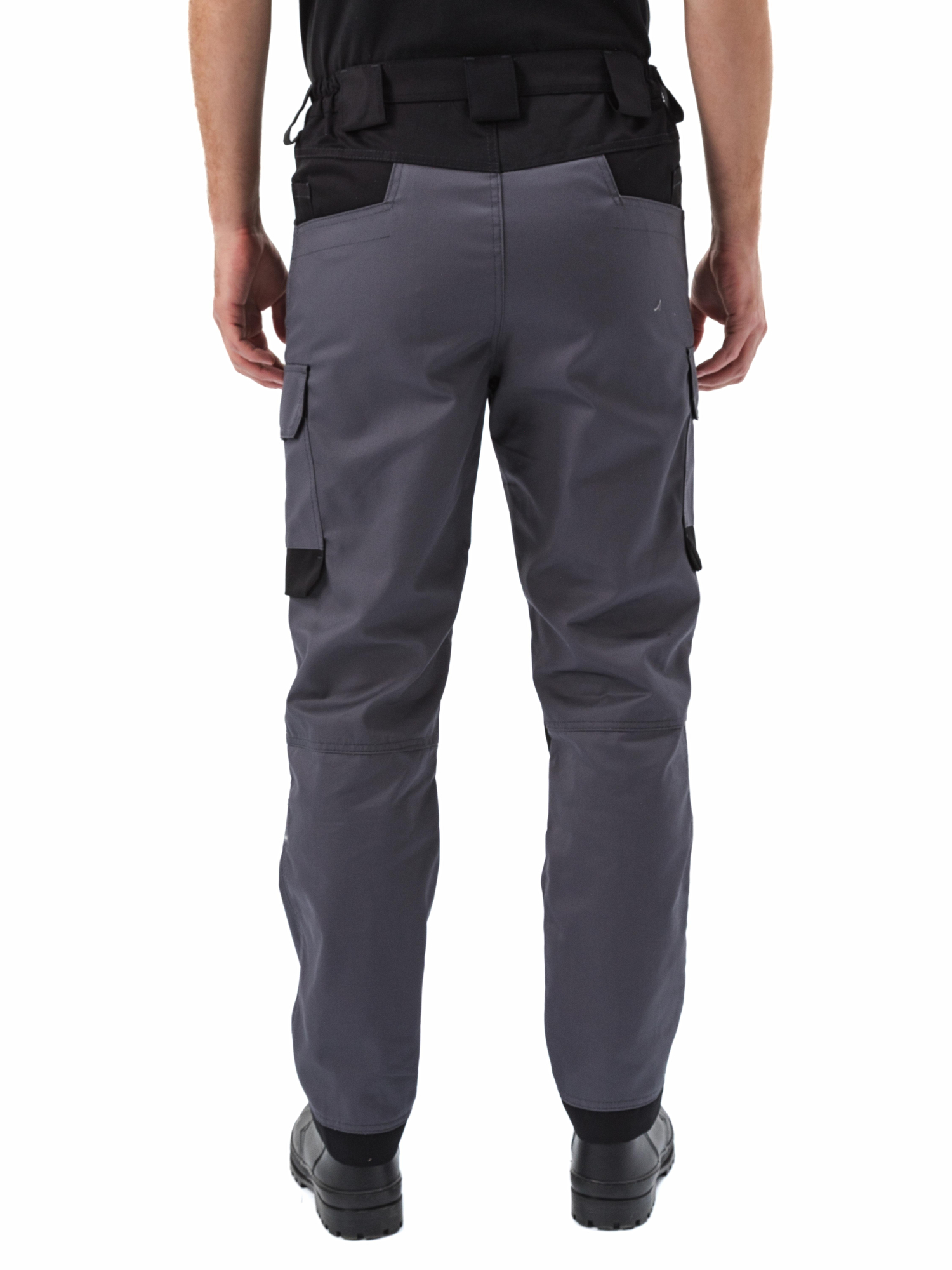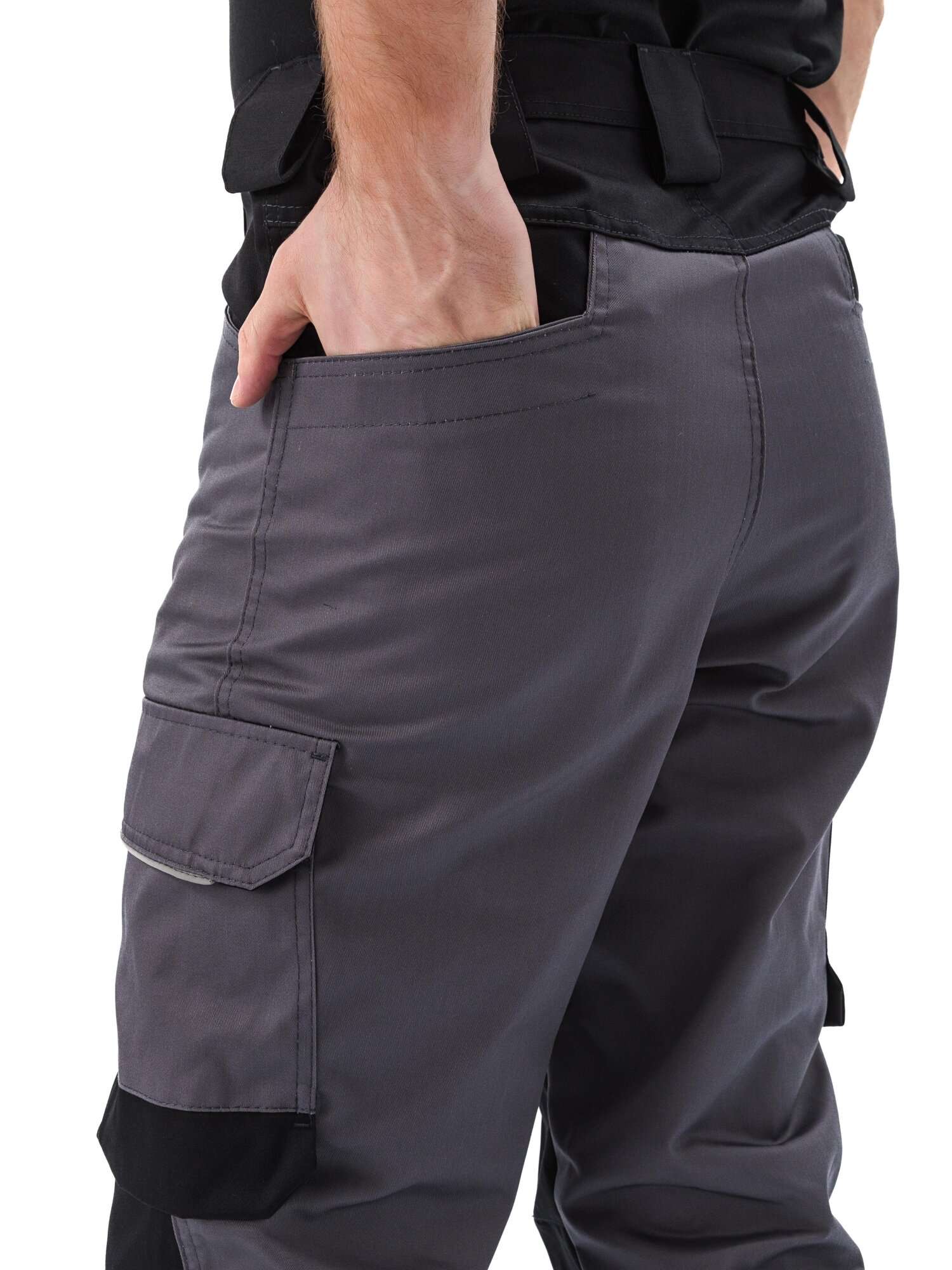 - Брюки прямые, эргономичного кроя, с дополнительным объемом в области колена с применением вытачек и фигурной кокетки в области пояса задних половинок брюк, способствует повышенному комфорту и снижению утомляемости при работе в положении сидя;