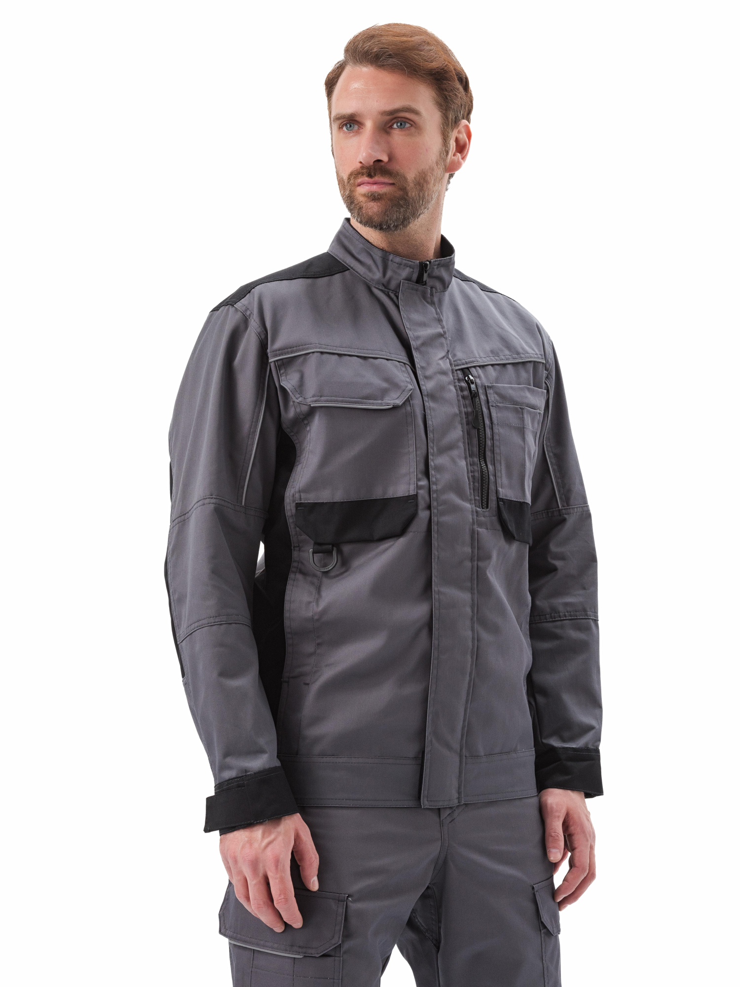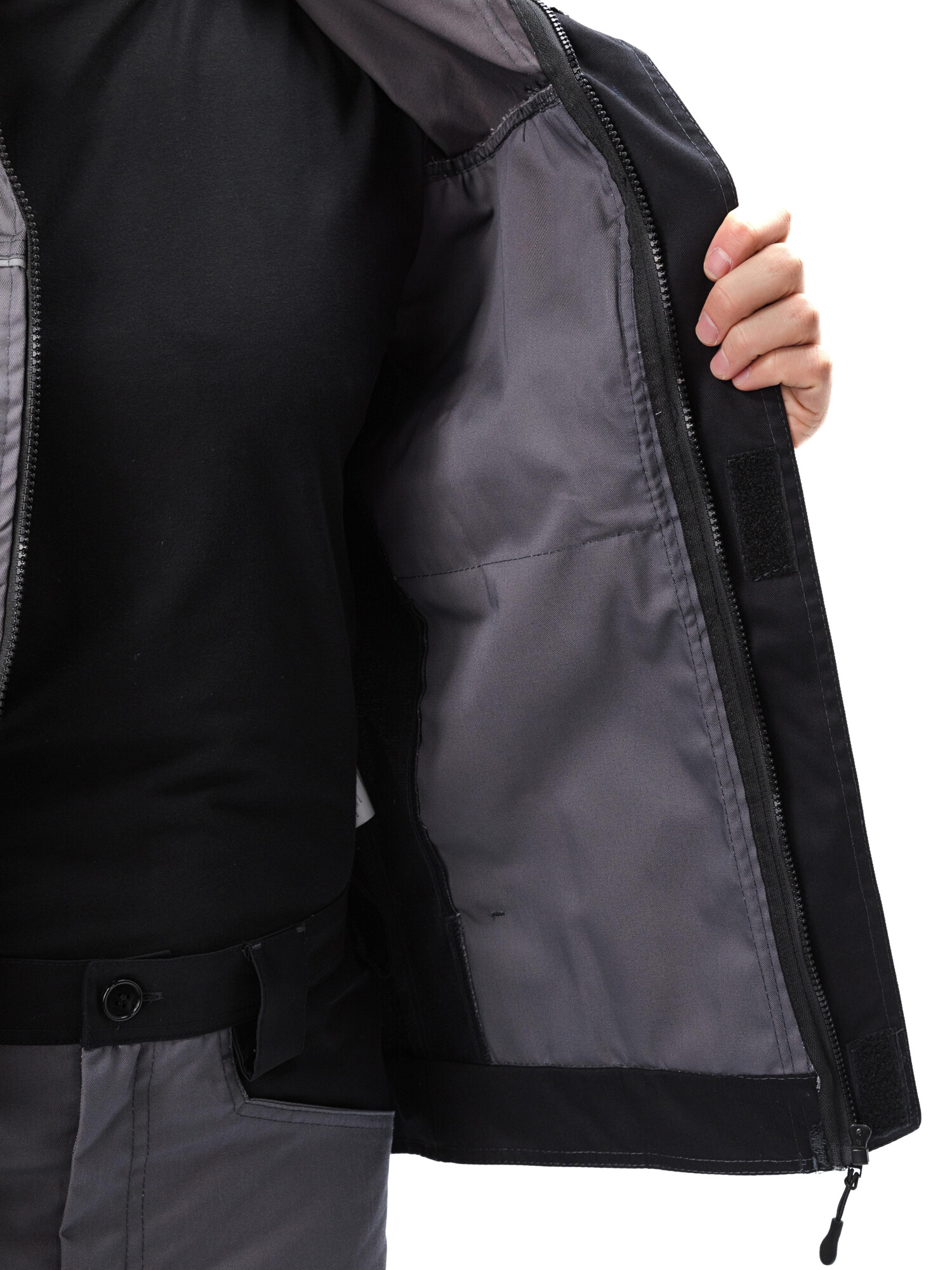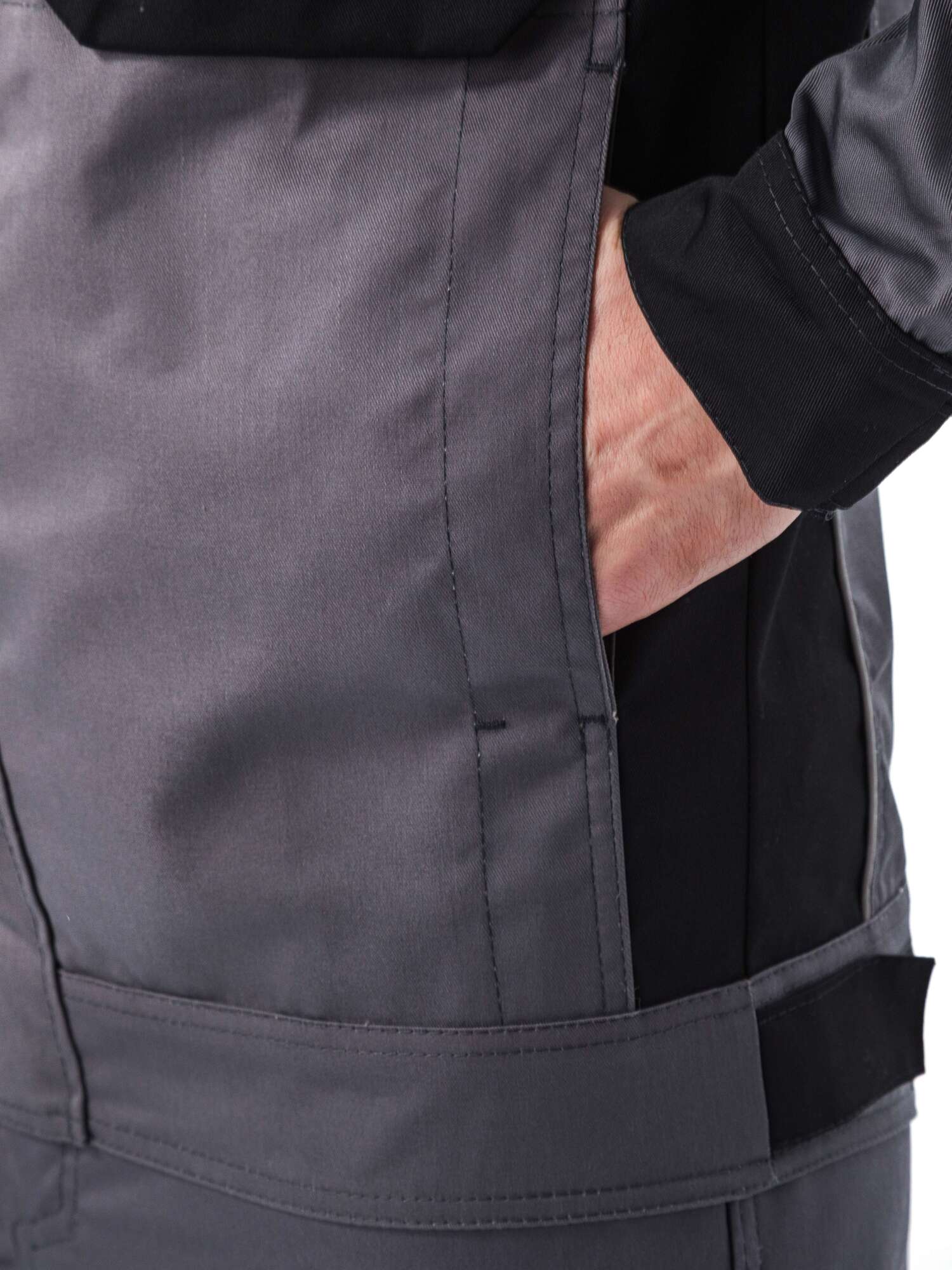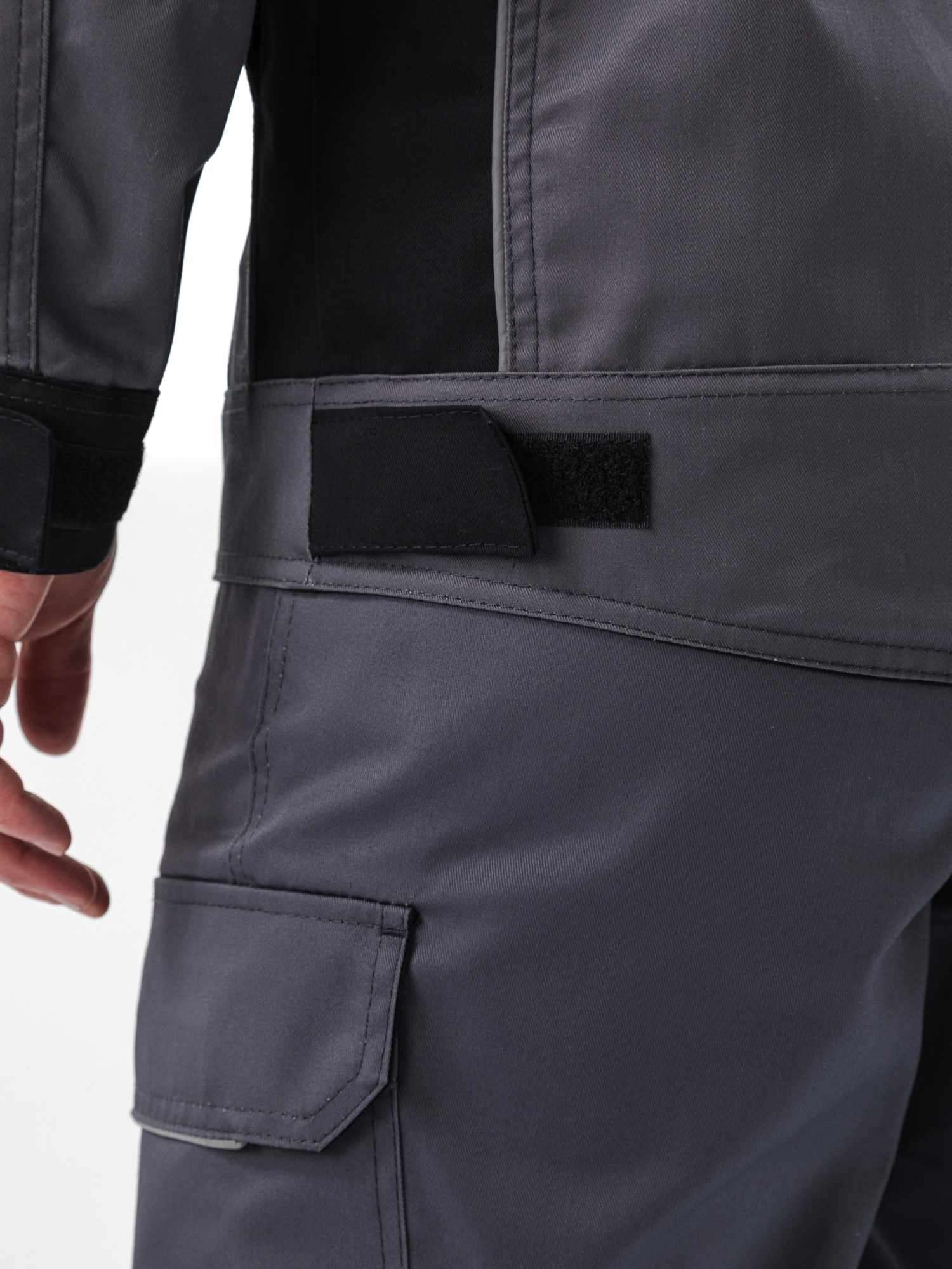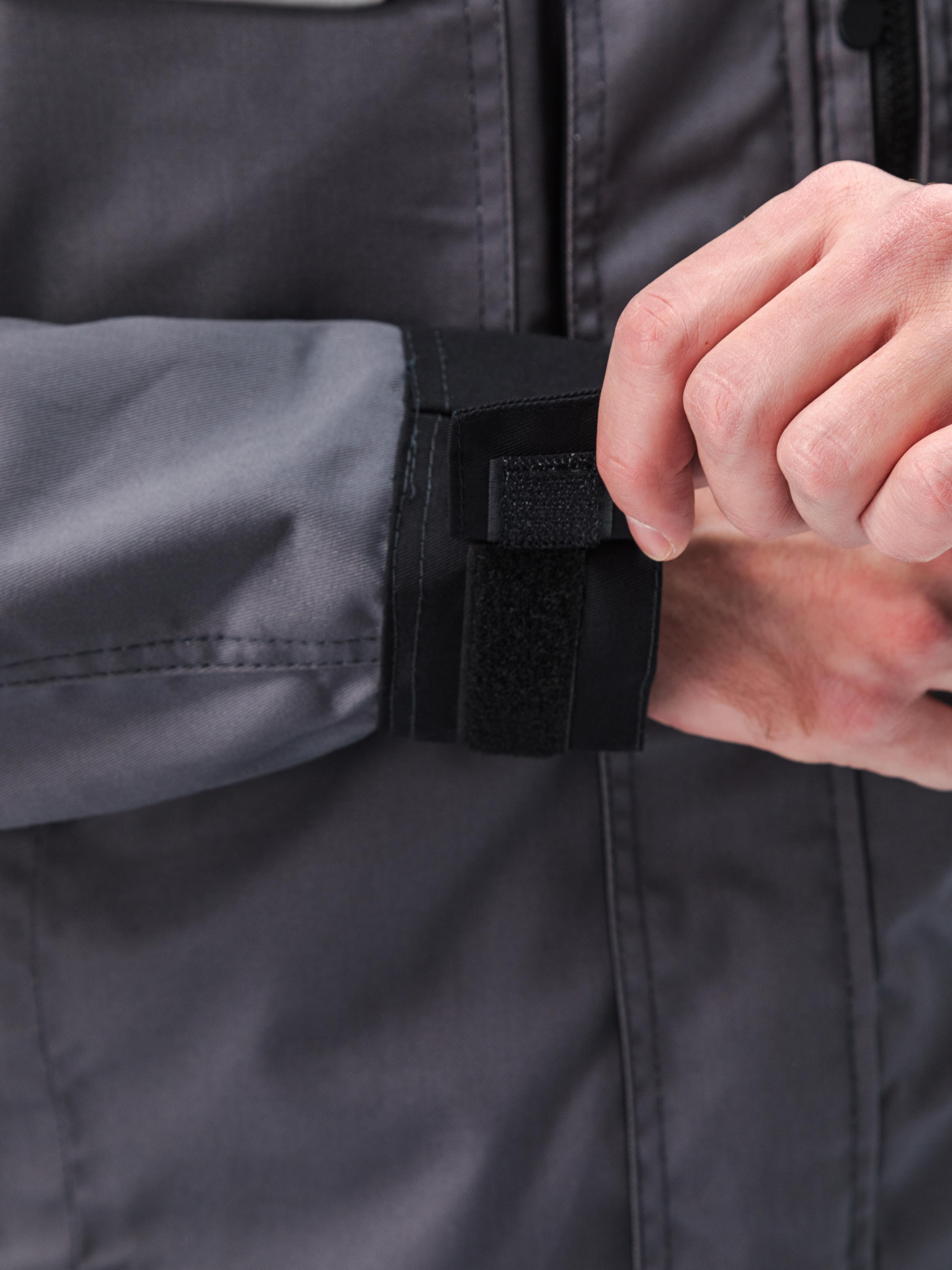 - Рукава имеют эргономичный крой с дополнительным объемом в области локтя с помощью вытачек. Низ рукавов на манжете из отделочной ткани, ширина манжеты регулируется с помощью паты на липучке;