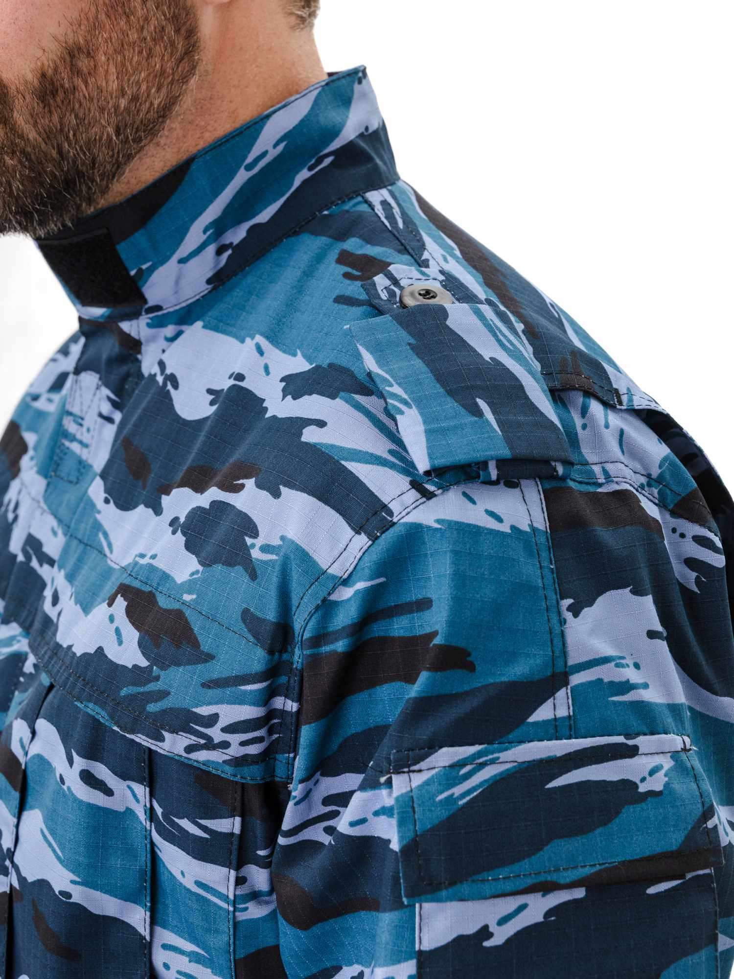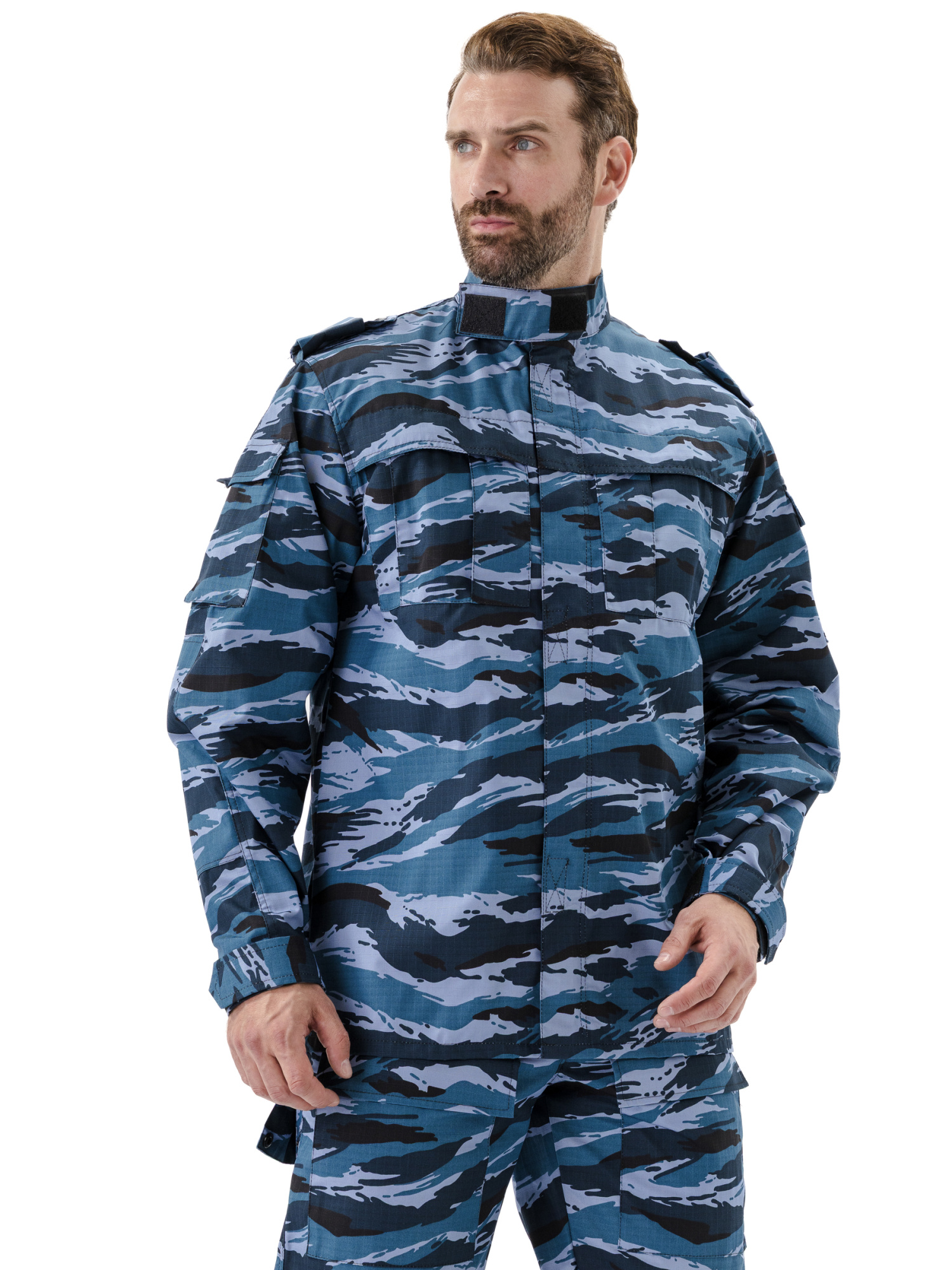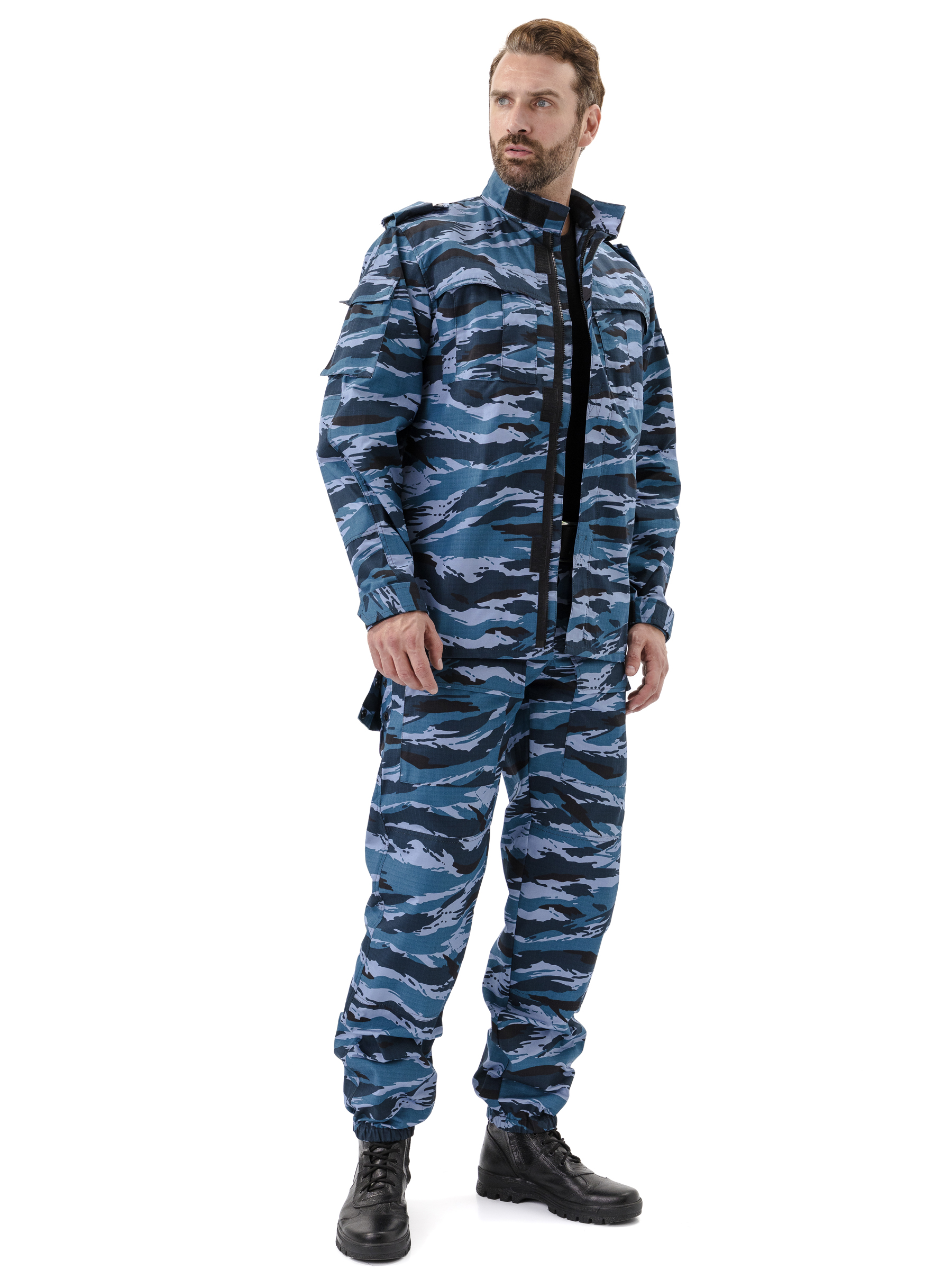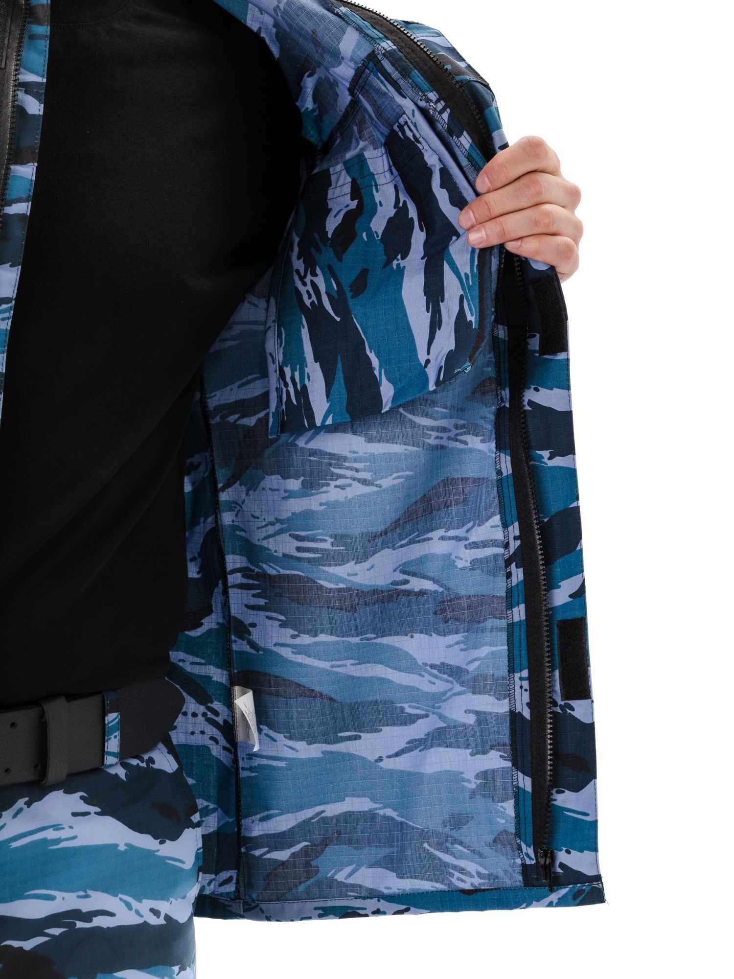 Куртка прямого силуэта удлиненная, фасон предполагает возможность заправить куртку в брюки. Центральная застежка на молнию с планкой на липучках; два нагрудных объемных накладных кармана со складками на молнию под отлетным краем кокетки; погоны на пуговице; спинка со складками до линии талии для свободы движения; рукава на манжете с патой на широкой липучке; накладные объемные карманы на рукавах с клапаном на липучке; усилительные накладки в области локтя; воротник стойка с патой на липучке; внутренний навесной карман на липучке.