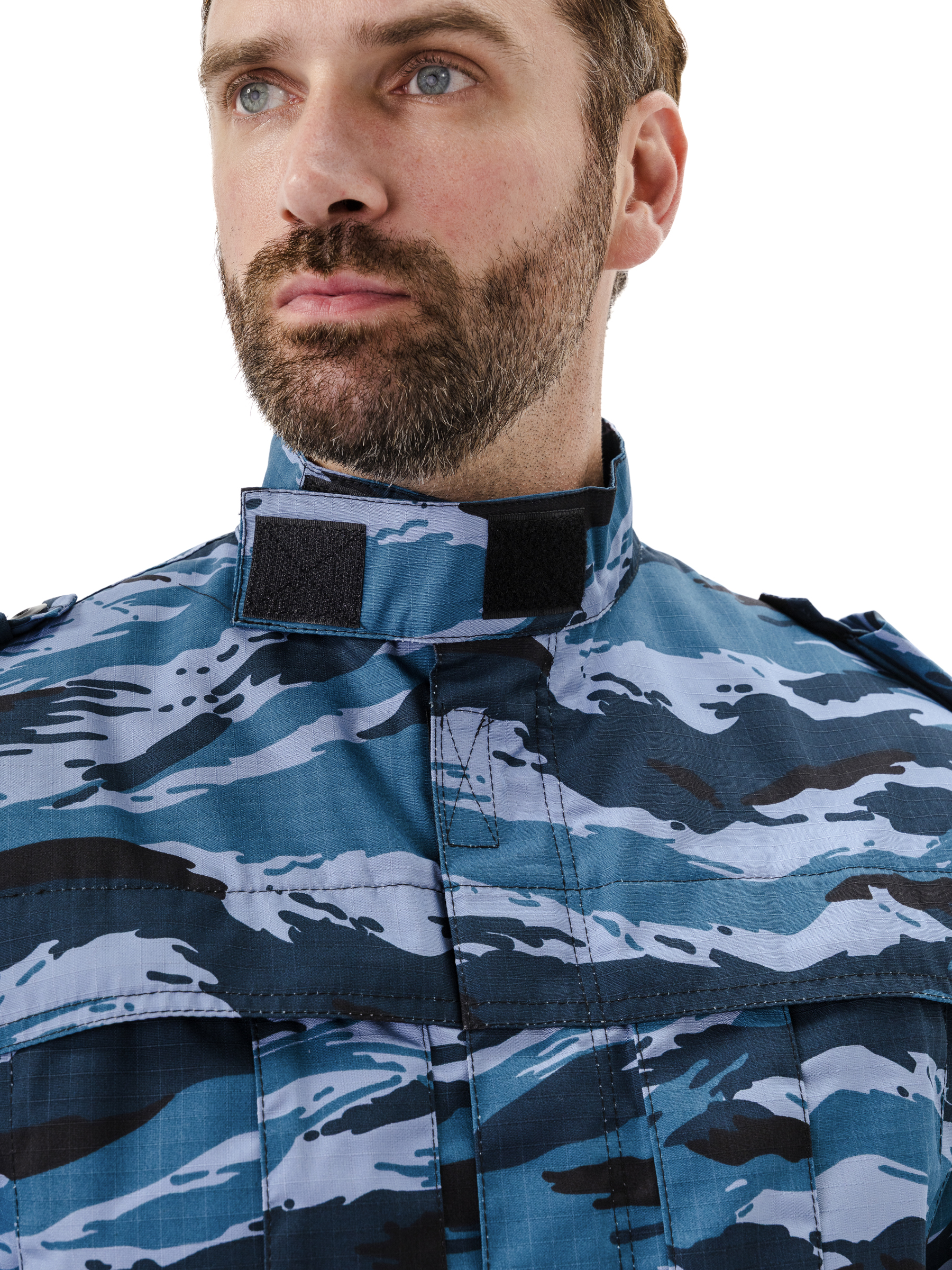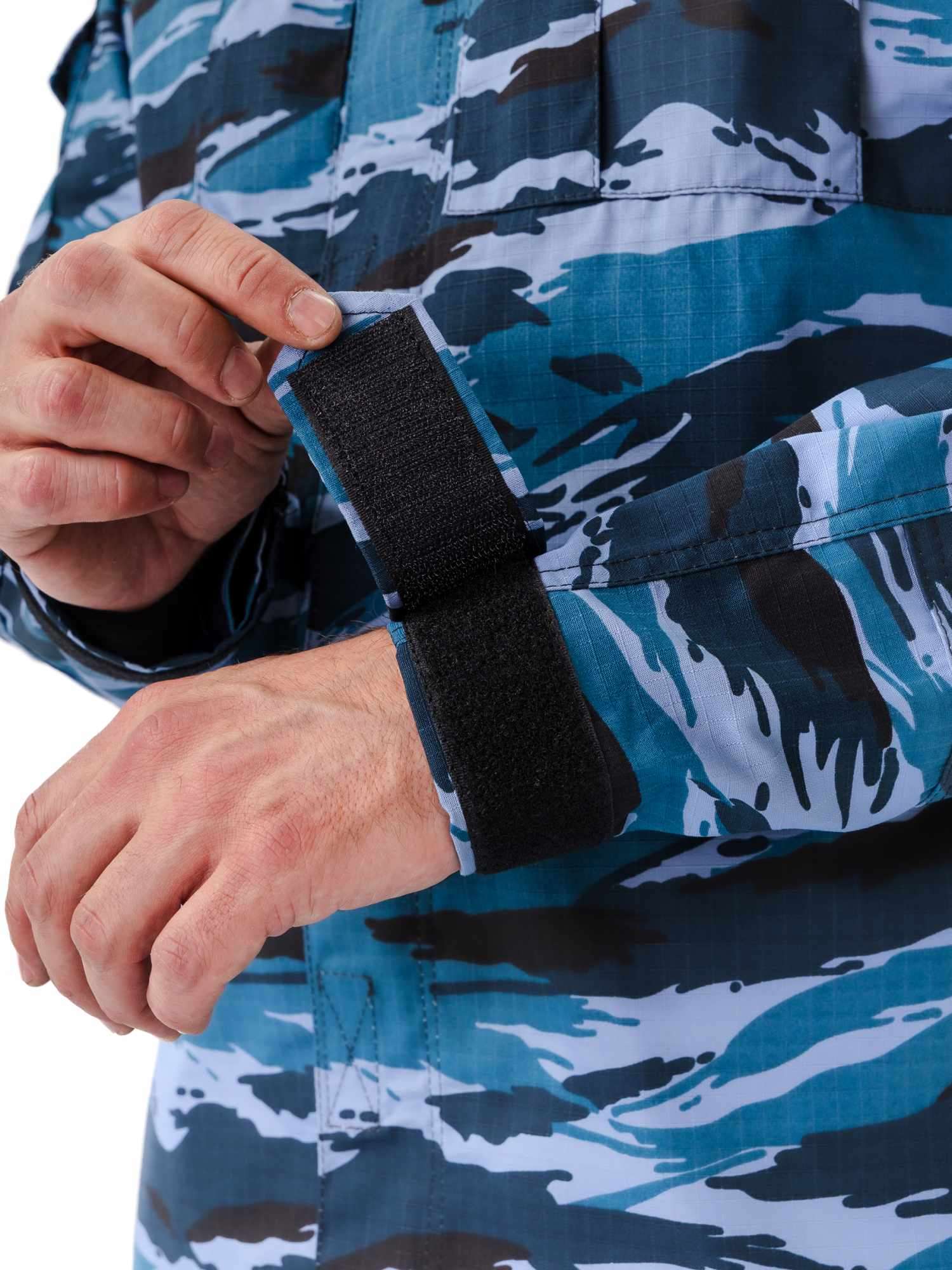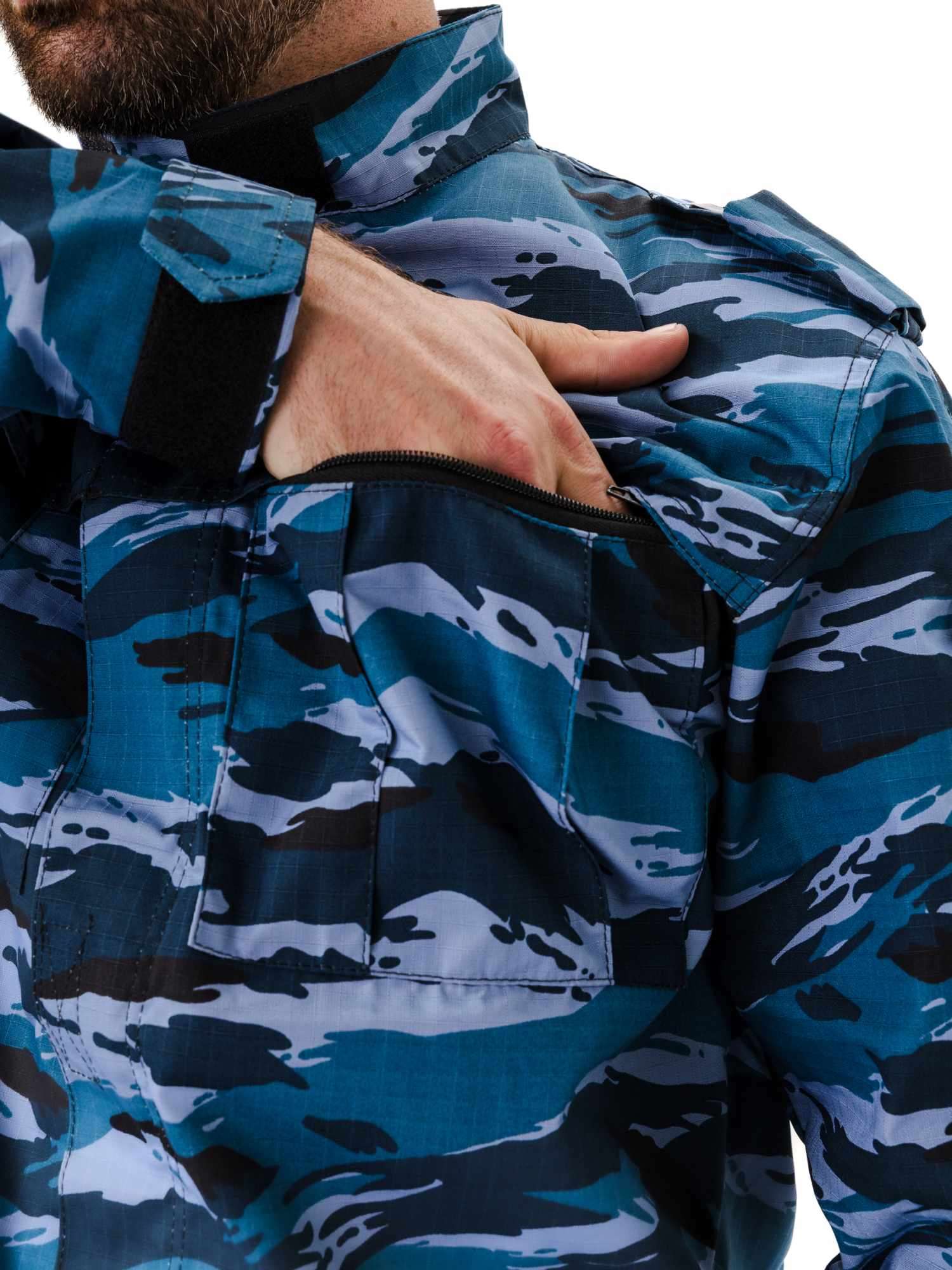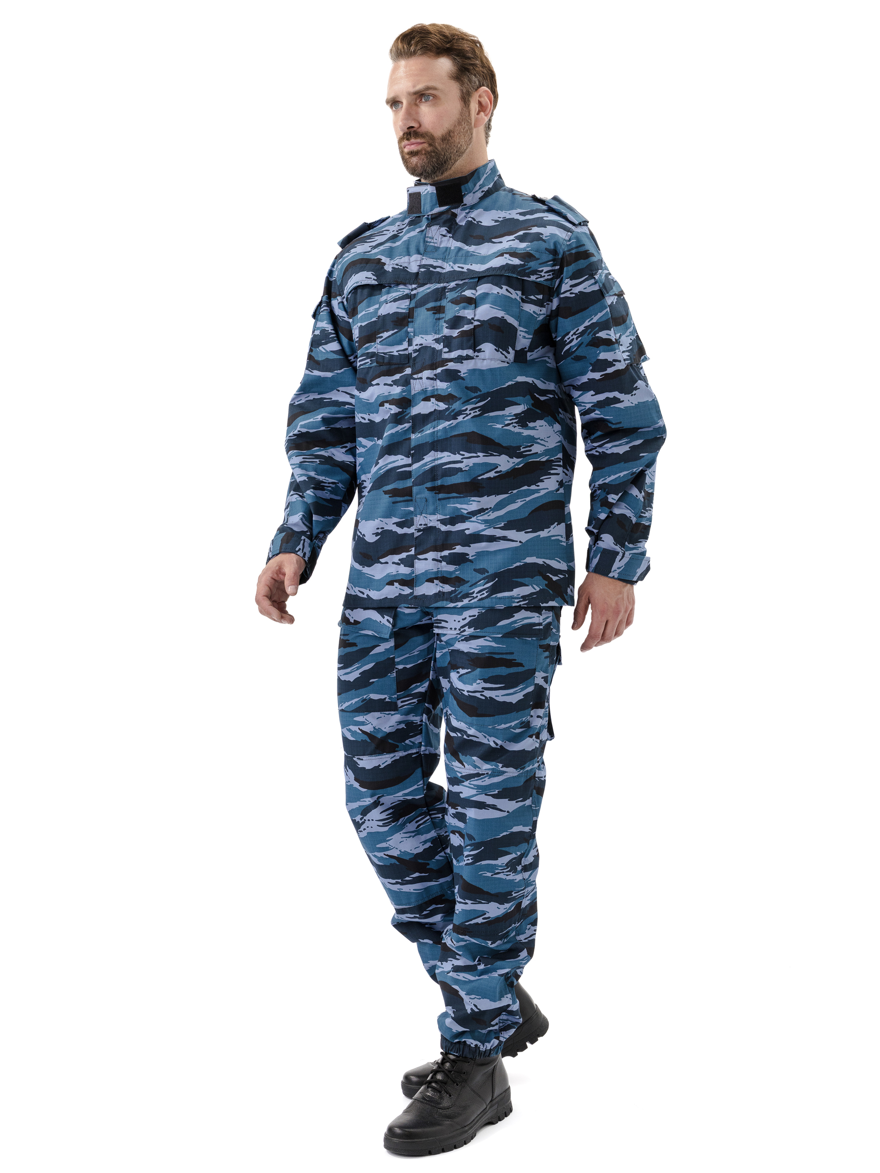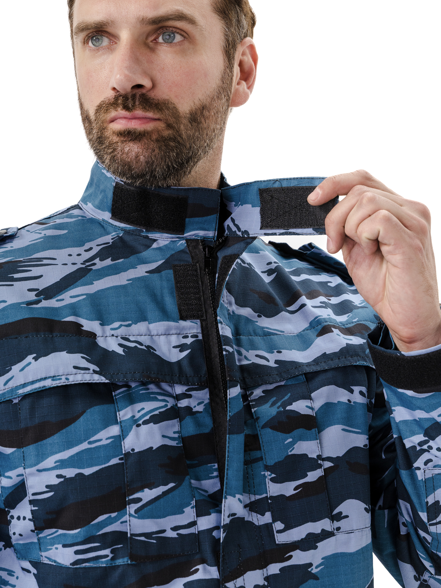 Куртка прямого силуэта удлиненная, фасон предполагает возможность заправить куртку в брюки. Центральная застежка на молнию с планкой на липучках; два нагрудных объемных накладных кармана со складками на молнию под отлетным краем кокетки; погоны на пуговице; спинка со складками до линии талии для свободы движения; рукава на манжете с патой на широкой липучке; накладные объемные карманы на рукавах с клапаном на липучке; усилительные накладки в области локтя; воротник стойка с патой на липучке; внутренний навесной карман на липучке.