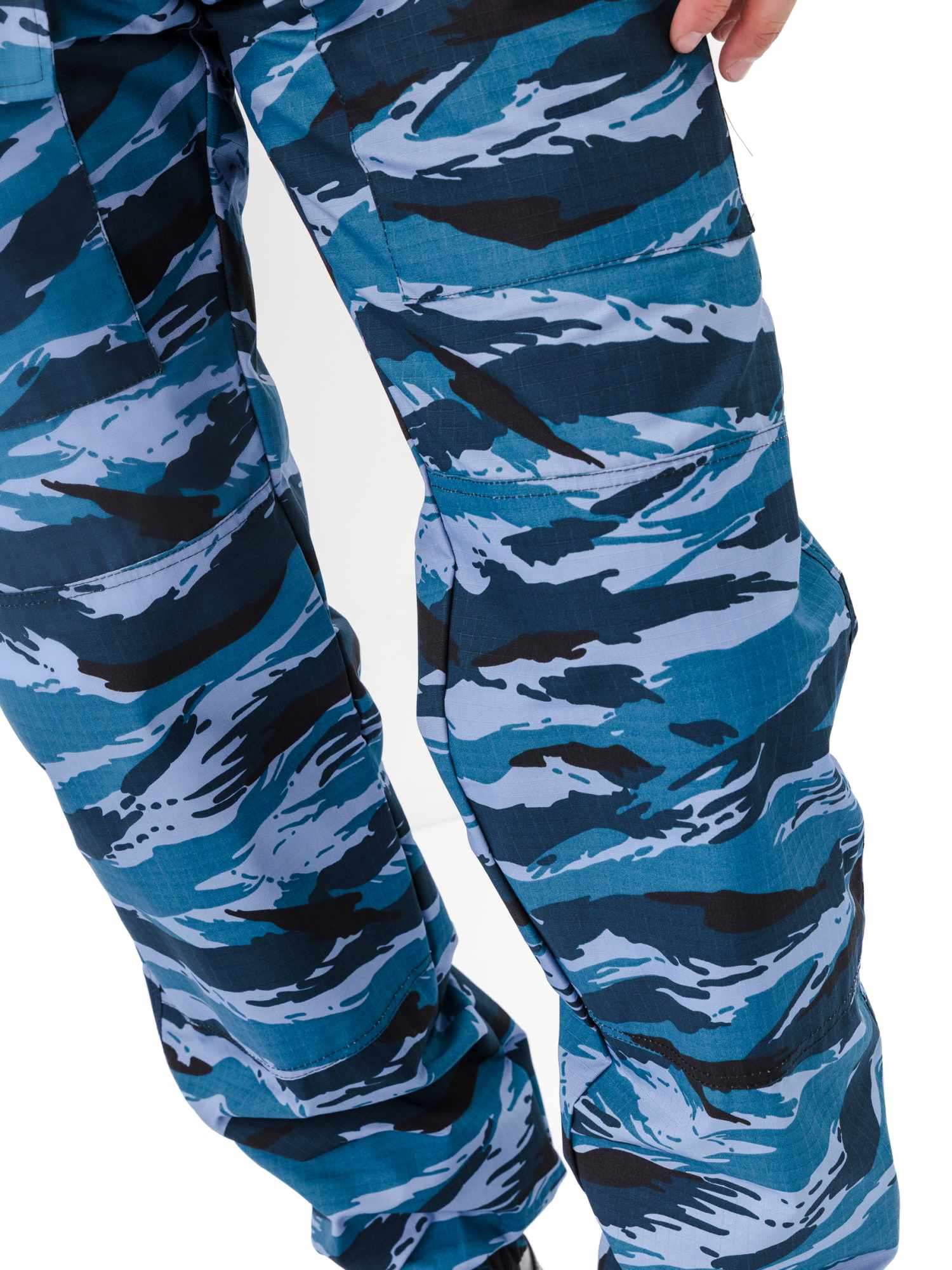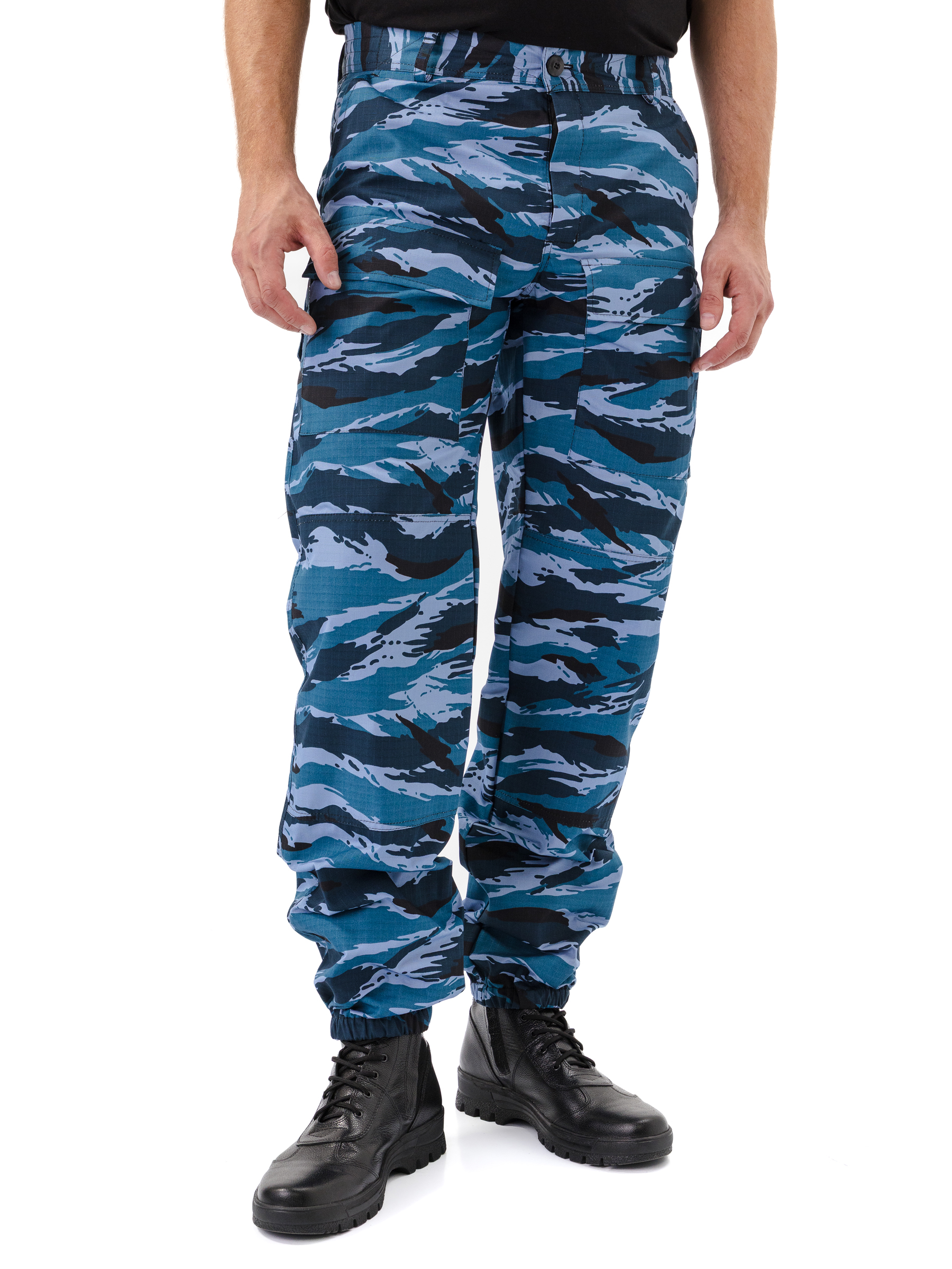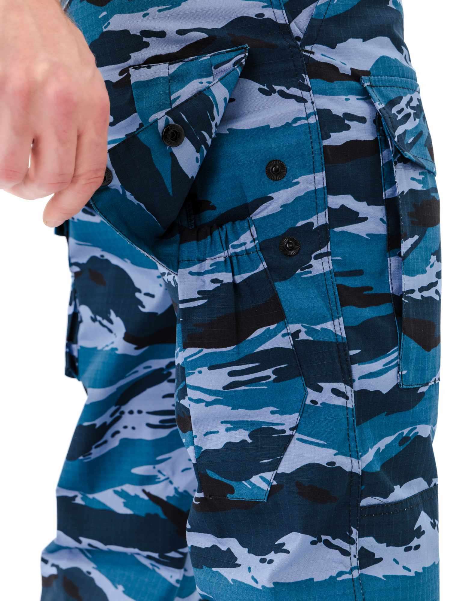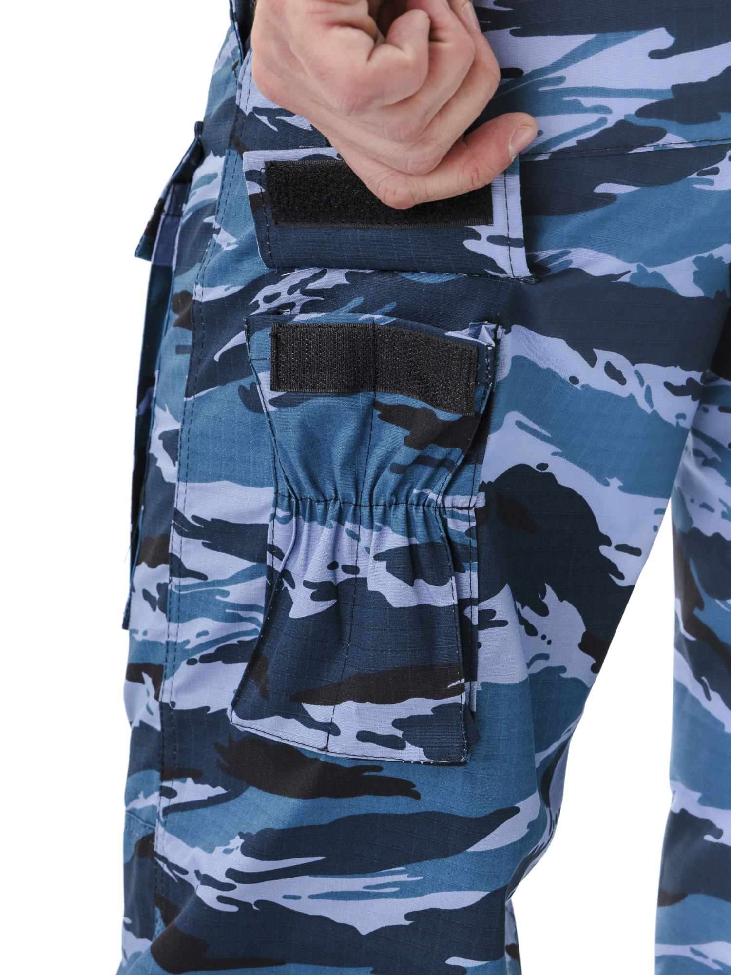 Брюки прямые, свободного кроя, с широким поясом, стянутым боковыми резинками, со шлевками и пуговицей; застежка – гульфик на молнии; в верхней части два кармана с косым входом; выше линии колена накладные объемные карманы с клапаном на липучку; на задней половинке брюк с левой стороны два объемных накладных кармана с клапаном на липучку; на правой задней половинке брюк карман-патронташ с клапаном на кнопках; усилительные накладки в области колена; низ брюк на резинке; штрипки из перфорированной резинки крепятся с изнаночной стороны на пуговицы.