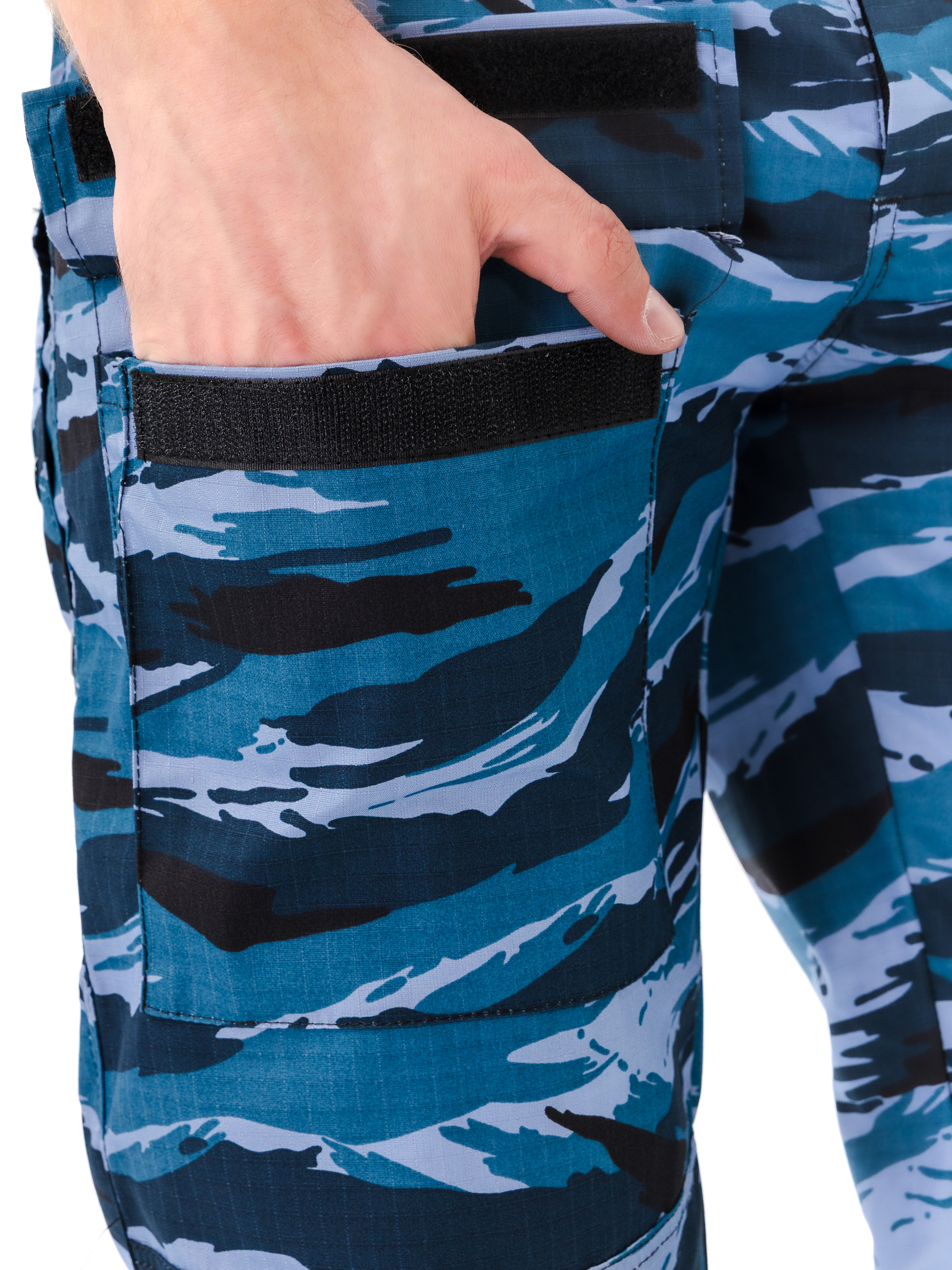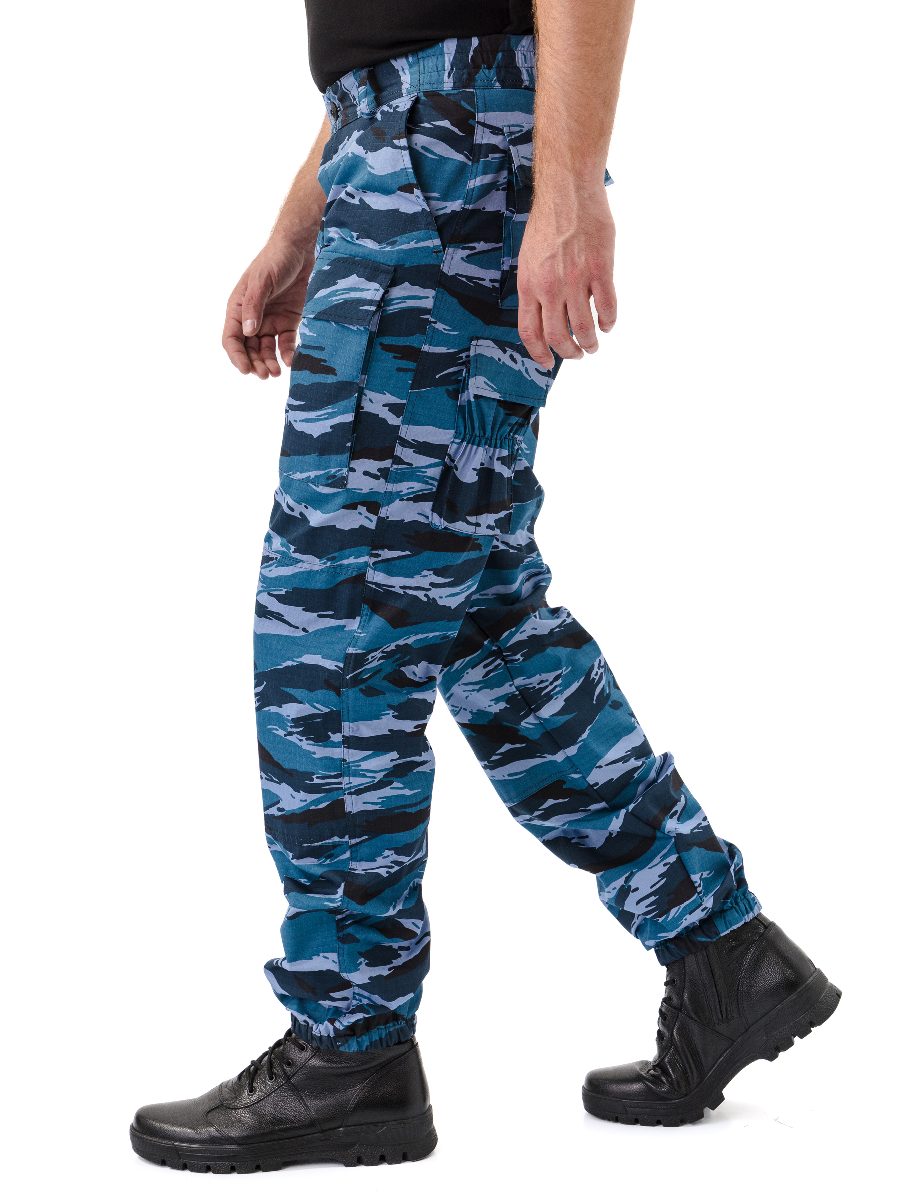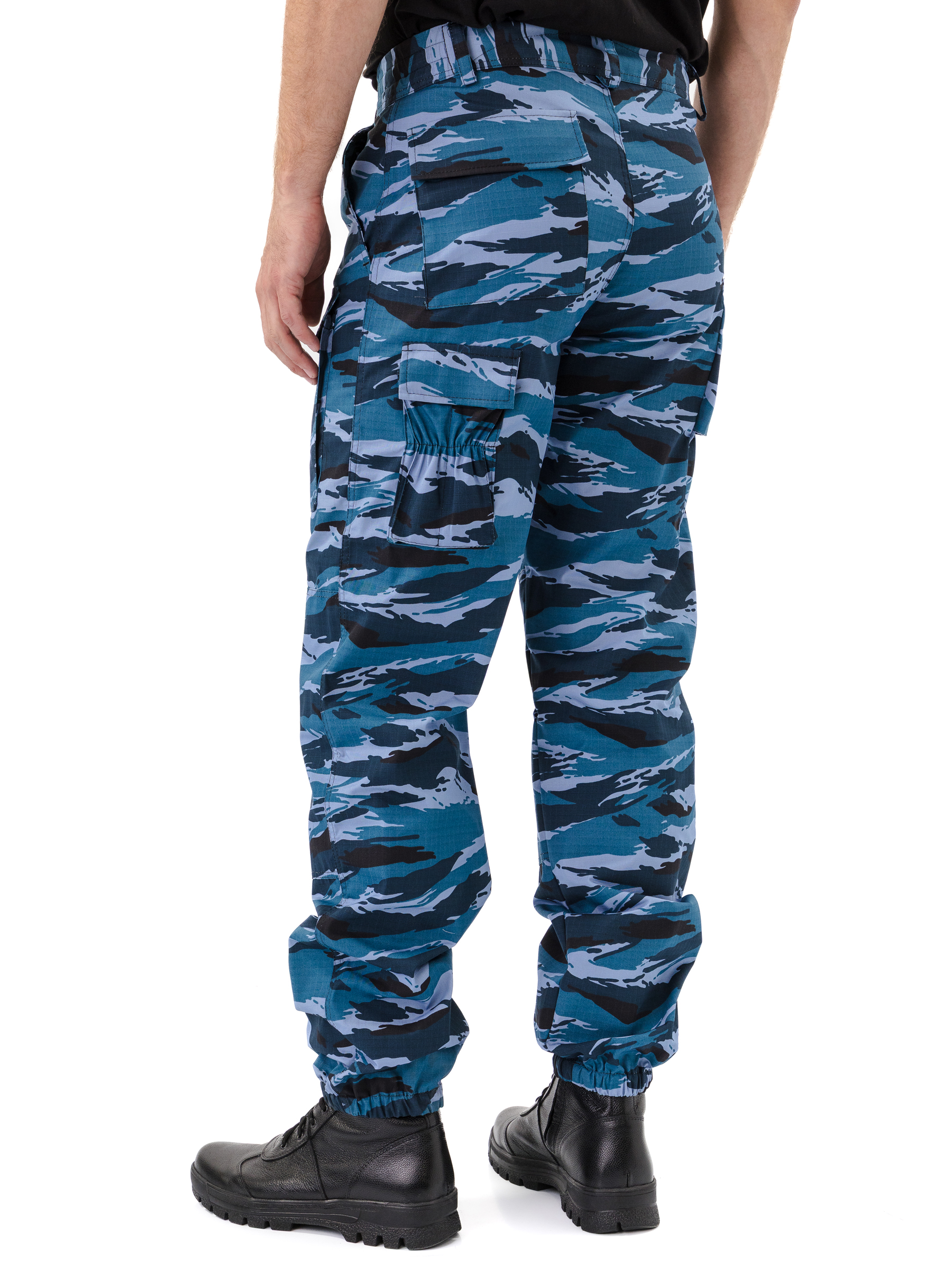 Брюки прямые, свободного кроя, с широким поясом, стянутым боковыми резинками, со шлевками и пуговицей; застежка – гульфик на молнии; в верхней части два кармана с косым входом; выше линии колена накладные объемные карманы с клапаном на липучку; на задней половинке брюк с левой стороны два объемных накладных кармана с клапаном на липучку; на правой задней половинке брюк карман-патронташ с клапаном на кнопках; усилительные накладки в области колена; низ брюк на резинке; штрипки из перфорированной резинки крепятся с изнаночной стороны на пуговицы.