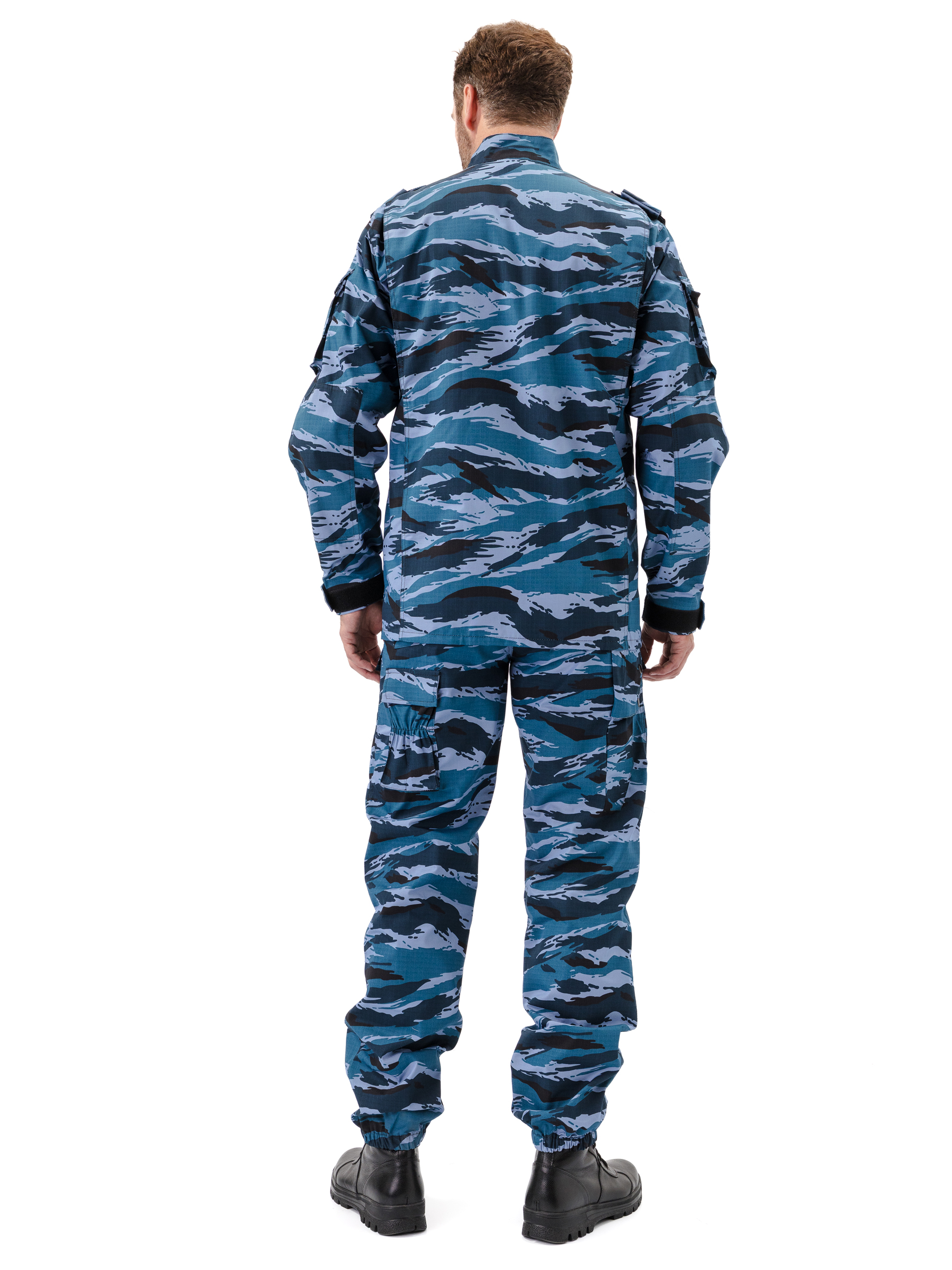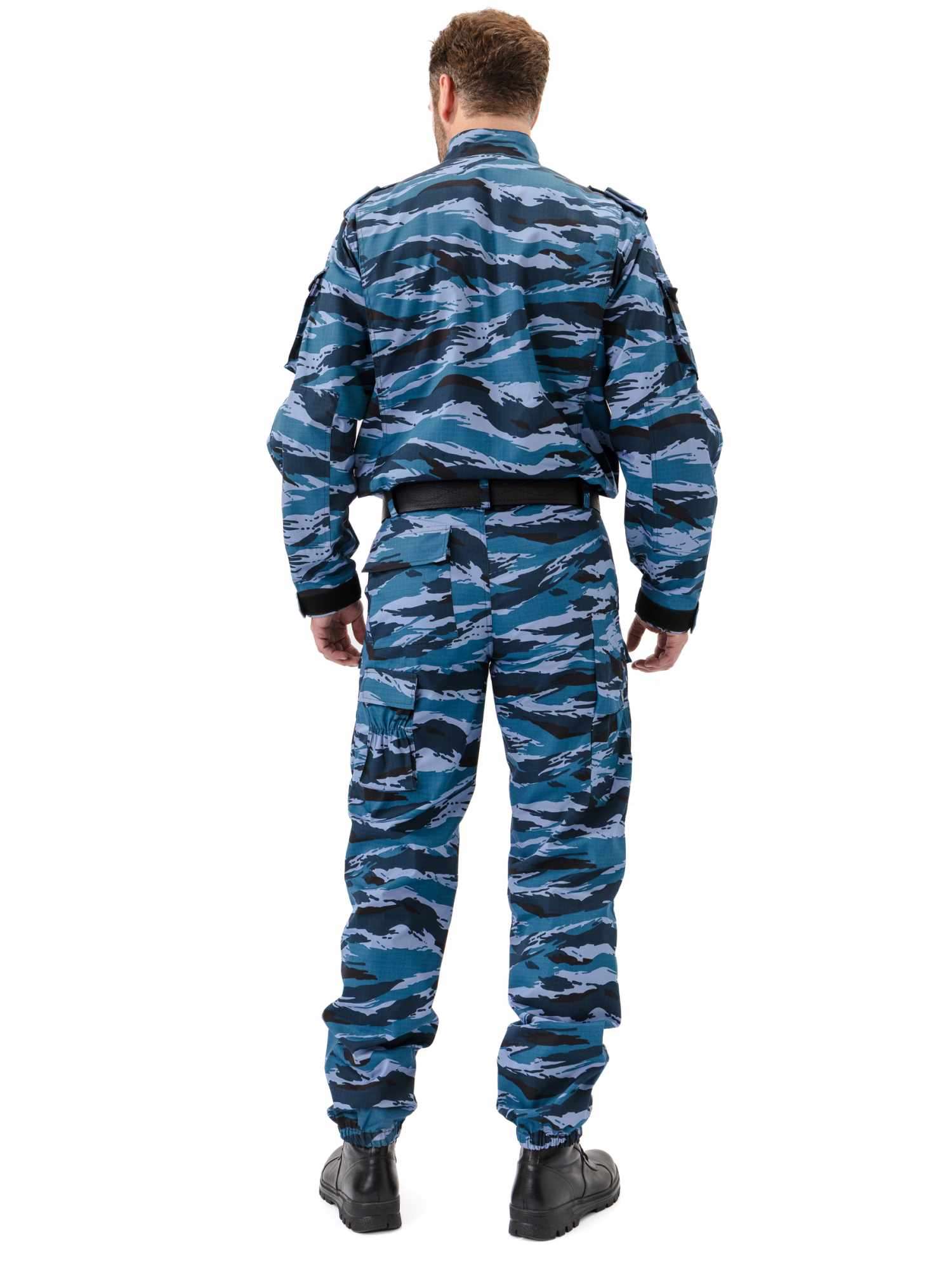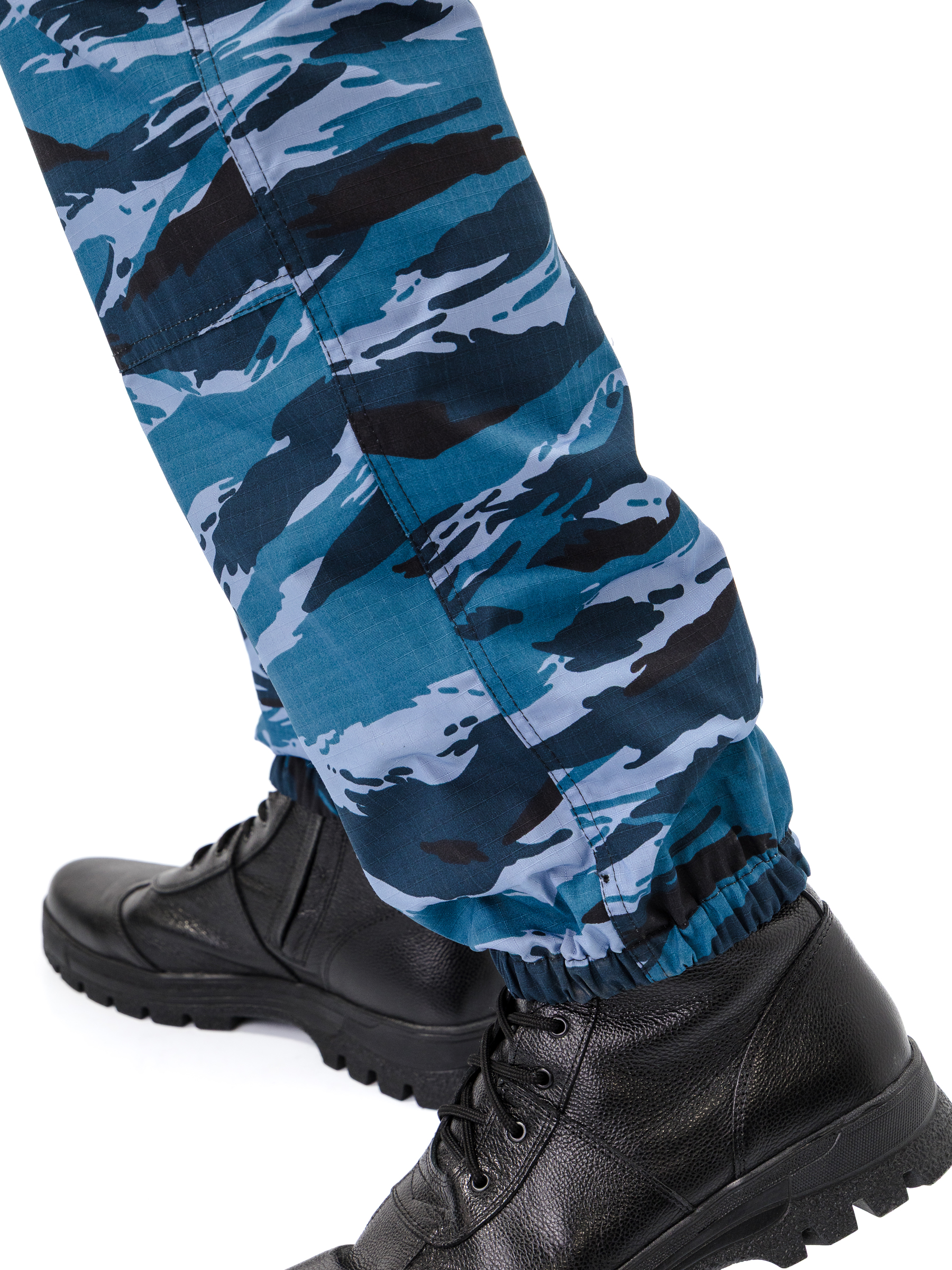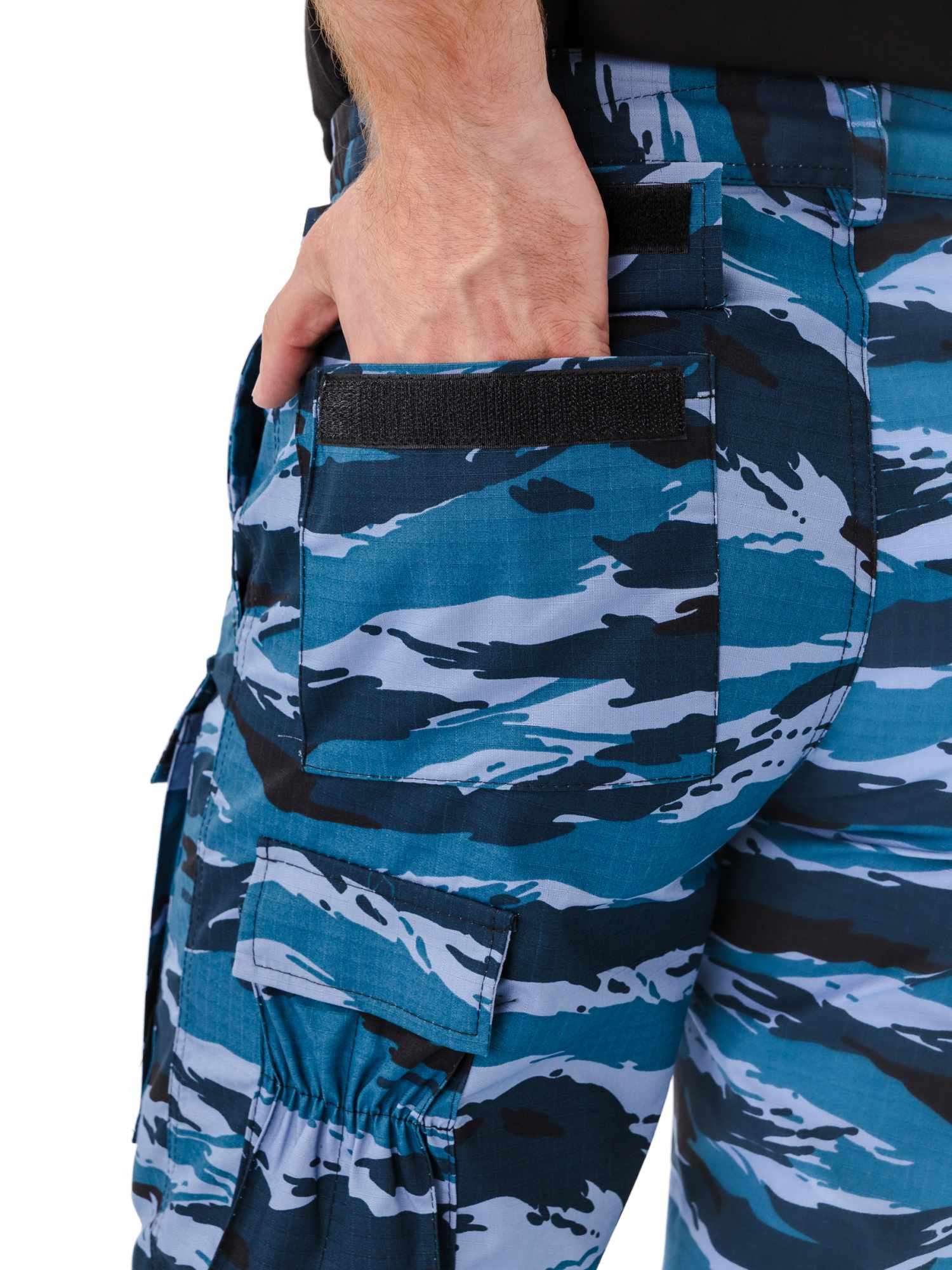 Брюки прямые, свободного кроя, с широким поясом, стянутым боковыми резинками, со шлевками и пуговицей; застежка – гульфик на молнии; в верхней части два кармана с косым входом; выше линии колена накладные объемные карманы с клапаном на липучку; на задней половинке брюк с левой стороны два объемных накладных кармана с клапаном на липучку; на правой задней половинке брюк карман-патронташ с клапаном на кнопках; усилительные накладки в области колена; низ брюк на резинке; штрипки из перфорированной резинки крепятся с изнаночной стороны на пуговицы.