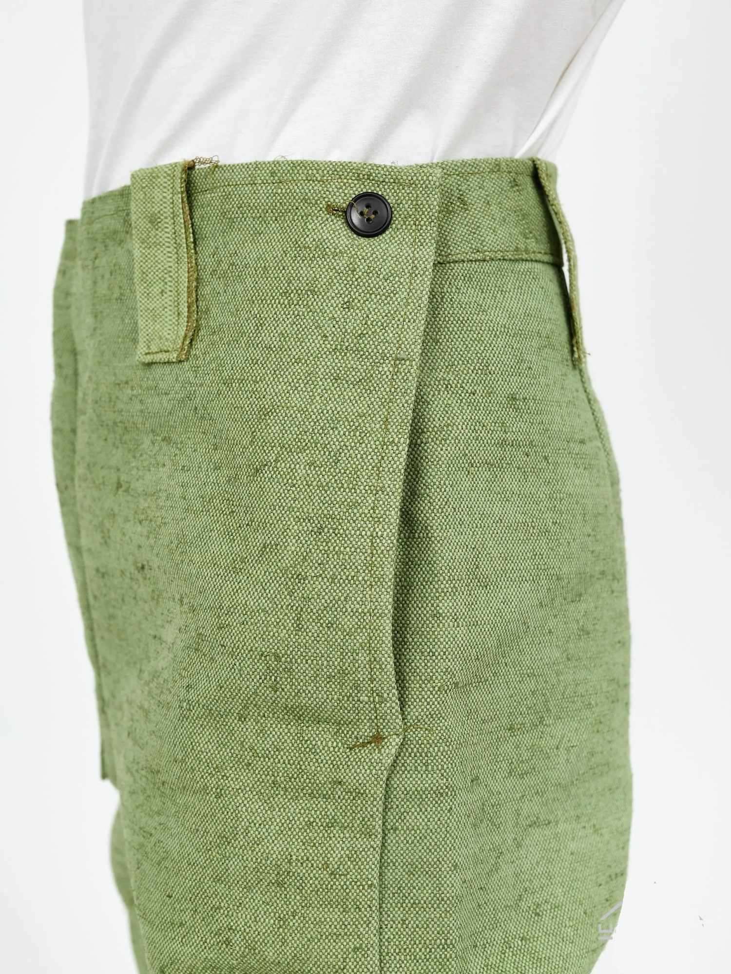 Брюки с цельнокроеным передним поясом и притачным задним, застежкой по бокам на петли и пуговицы. На поясе шлёвки. На правой передней половинке - накладной карман. По передним половинкам брюк в области коленей - накладки.