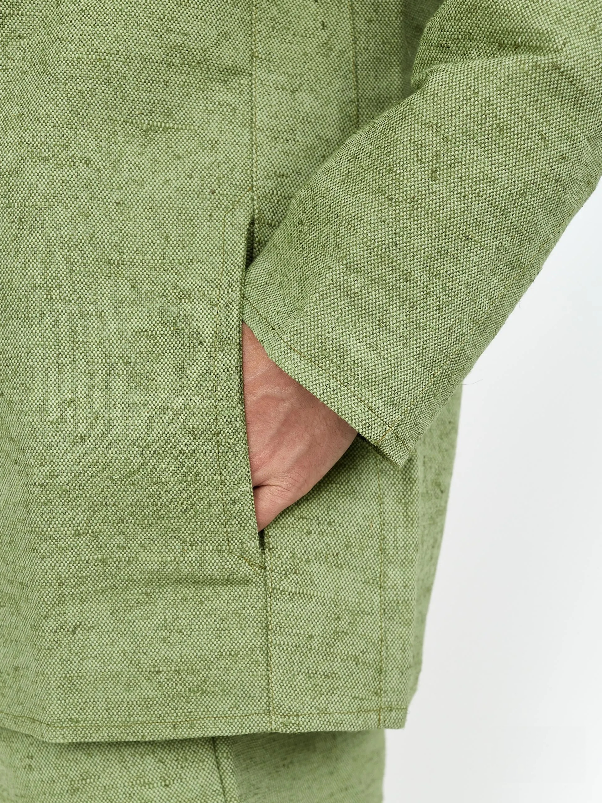 Куртка с центральной потайной застежкой на петли и пуговицы. Полочка с кокеткой. Полочка состоит из центральной и боковой частей. В швах стачивания внутренние боковые карманы - подзоры из парусины (брезента), мешковина из бязи. На отрезном бочке два вентиляционных отверстия - прорезные обмётанные петли.