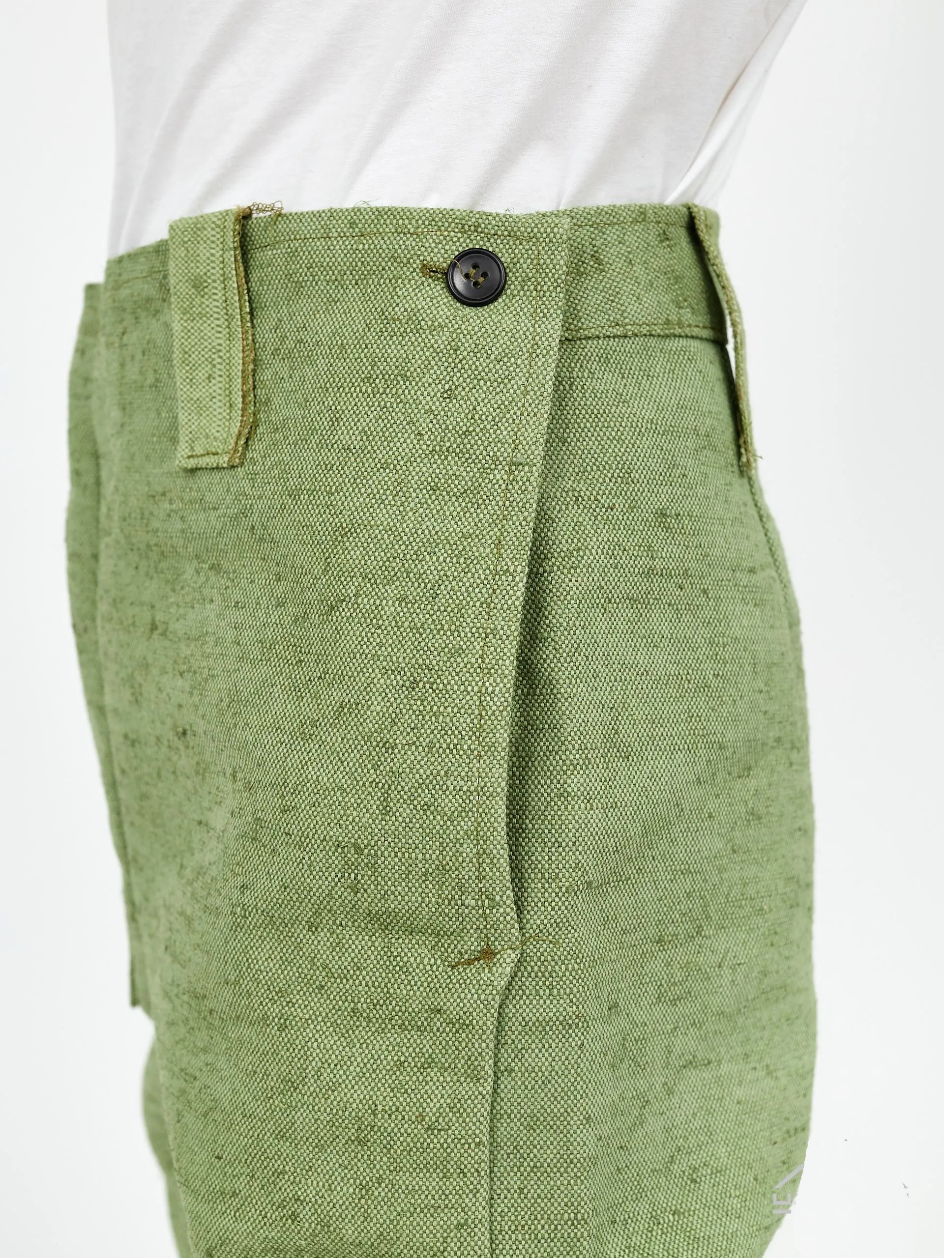 Брюки с цельнокроеным передним поясом и притачным задним, застежкой по бокам на петли и пуговицы. На поясе шлёвки. На правой передней половинке - накладной карман. По передним половинкам брюк в области коленей - накладки.