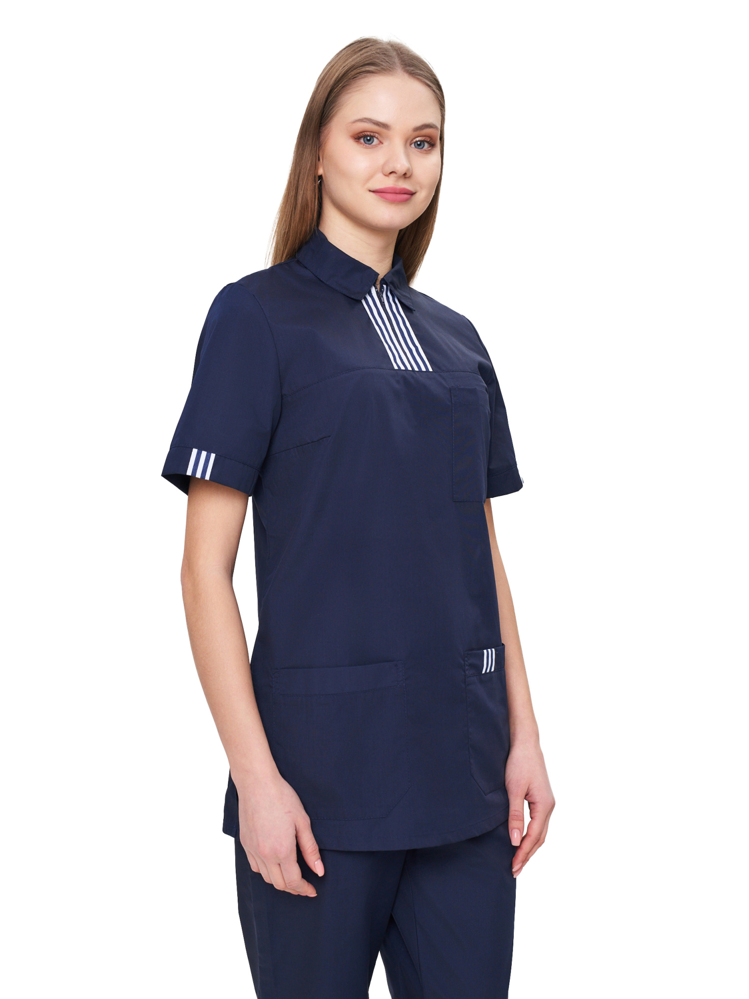 Современный удобный женский костюм со свободной посадкой, рекомендован для сферы косметологии и работников медицинских учреждений из высококачественной смесовой ткани прекрасно переносят многократные стирки и выглядят презентабельно даже при длительных сроках эксплуатации. Широкий размерный ряд продукции позволит без труда подобрать костюм правильно по фигуре, в соответствии со спецификой профессии и с учетом индивидуальных требований сотрудника. Костюм женский «Эра» для косметологов и медработников прост в уходе, не мнется и быстро сохнет, а материал долгое время сохранит свой первоначальный яркий цвет. Костюм состоит из блузы и брюк темно-синего цвета с отделкой декоративной лентой. Сегодня современная мода вмешивается не только в подиумные и уличные образы. Она диктует свои правила разным сферам жизни, в том числе в сфере косметологии и медицине. Костюм состоит из прочной смесовой ткани ТИСИ, отталкивающей различного рода загрязнения. Материал устойчив к пятнам и истиранию, тем самым косметологи и медработники всегда будут выглядеть опрятно и привлекательно.