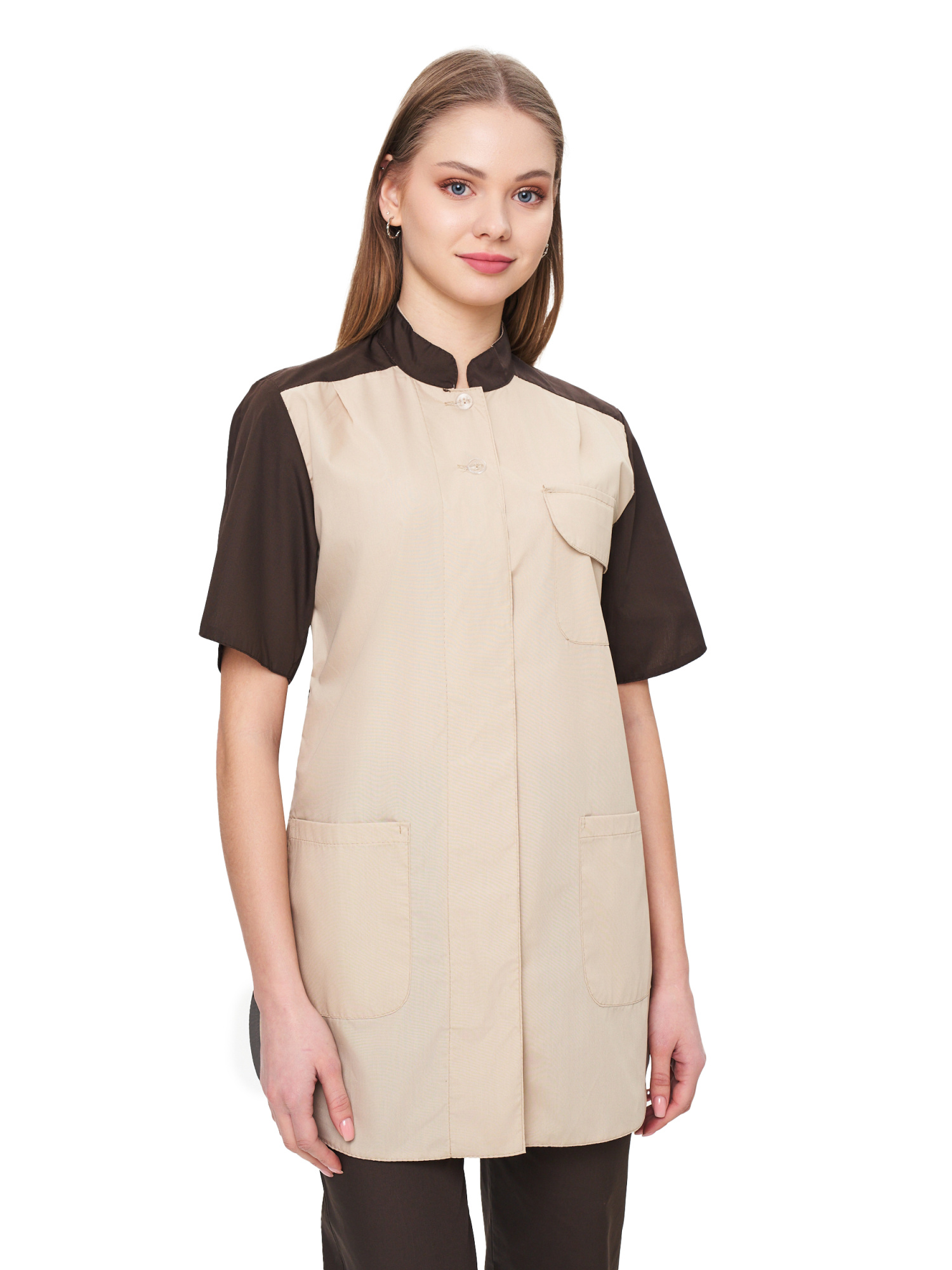 Современный удобный женский костюм со свободной посадкой, рекомендован для сферы обслуживания, клининга, гостиничного бизнеса (HORECA) из высококачественной смесовой ткани убережет от загрязнений и послужит отличным помощником в решении задач любой сложности. Костюм для горничных и уборщиц прост в уходе, не мнется и быстро сохнет, а материал долгое время сохранит свой первоначальный яркий цвет. Костюм состоит из блузы шоколадного (коричневого) и полочкой бежевого цвета и брюк шоколадного (коричневого) цвета. Спецодежда для горничных является особенным видом профессиональной униформы. Она создана для сферы обслуживания, работники которой всегда должны выглядеть безупречно. Одежда для горничных строго регламентируется администрацией гостиницы или отеля, поэтому ее состоянию уделяется большое внимание. Костюм состоит из прочной смесовой ткани ТИСИ, отталкивающей различного рода загрязнения. Материал устойчив к пятнам и истиранию, тем самым уборщицы всегда будут выглядеть опрятно и привлекательно.