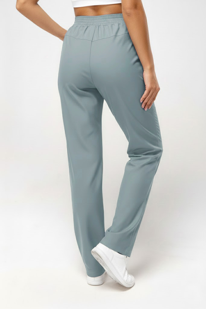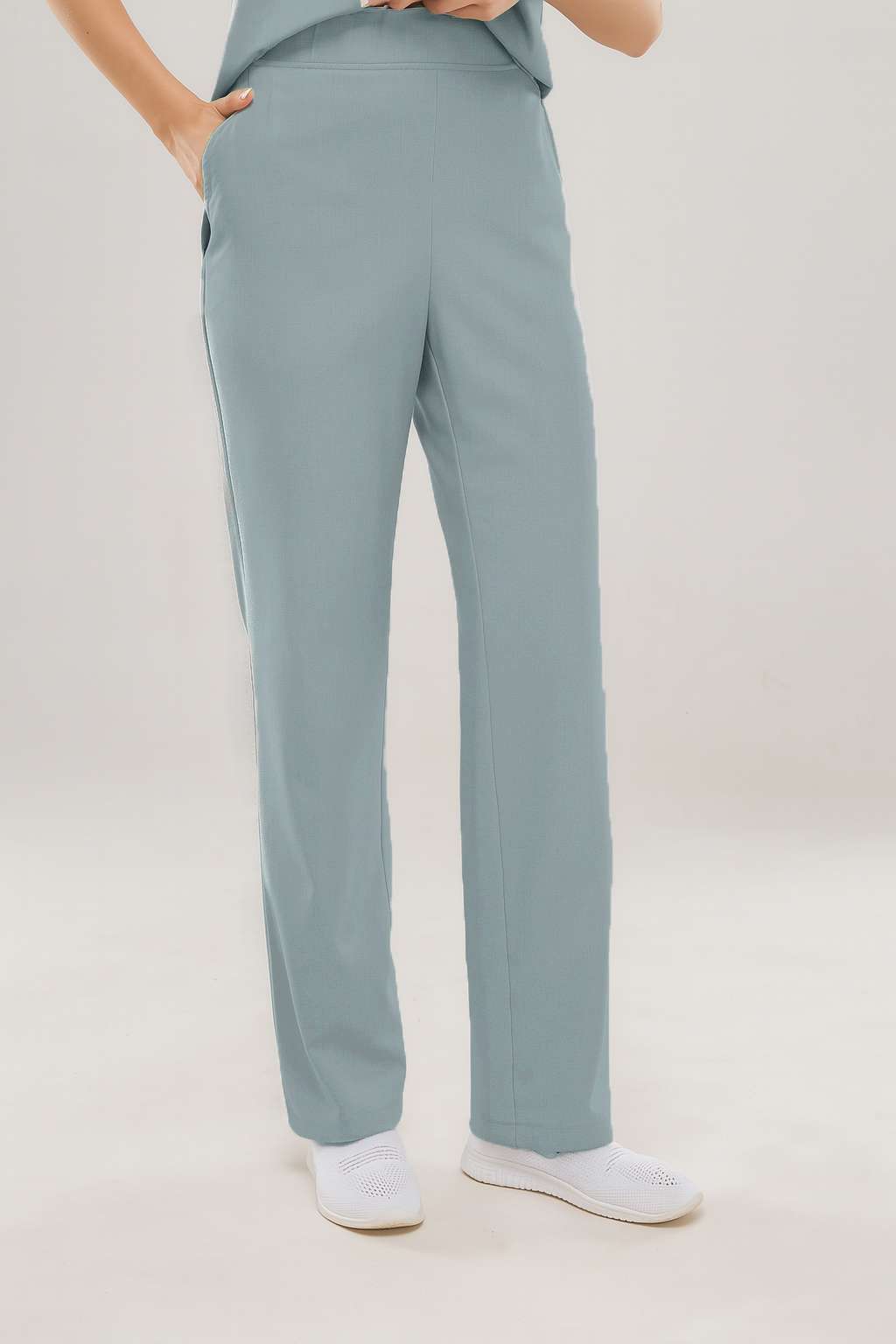 Брюки прямые с притачным поясом на резинке. Верхние боковые карманы по переду брюк с наклонным входом.