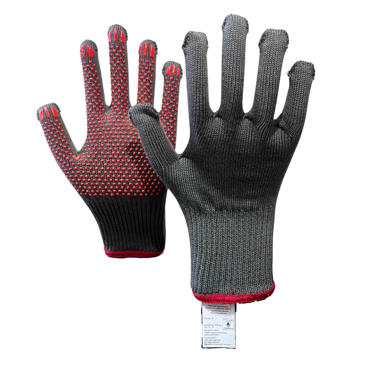 (применяемые в комплекте с одеждой специальной защитной от термических рисков электрической дуги), от повышенных температур (от теплового излучения, конвективной теплоты, контакта с нагретыми до 250 °C поверхностями, от кратковременного воздействия пламени), от механических воздействий (истирание), из антистатического пара- и мета- арамидного волокна, модель «АГНИ» Состав: 93% метаарамидное волокно, 5% параарамидное волокно, 2% антистатическое волокно.
