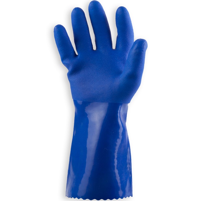 Перчатки, предназначенные для работ, при которых важна высокая химическая устойчивость и механическая защита. Перчатки изготовлены из высокопрочного ПВХ, внутренний слой выполнен из хлопка. Текстурное покрытие обеспечивает надежный захват. Хлопковая основа обеспечивает высокий комфорт. Высокая стойкость к кислотам (80%) и щелочам (50%), солям, спиртам, растворителям.