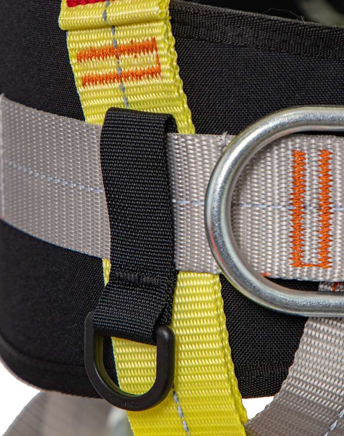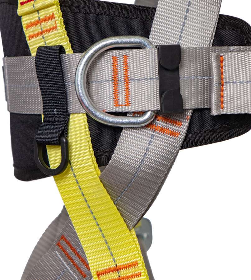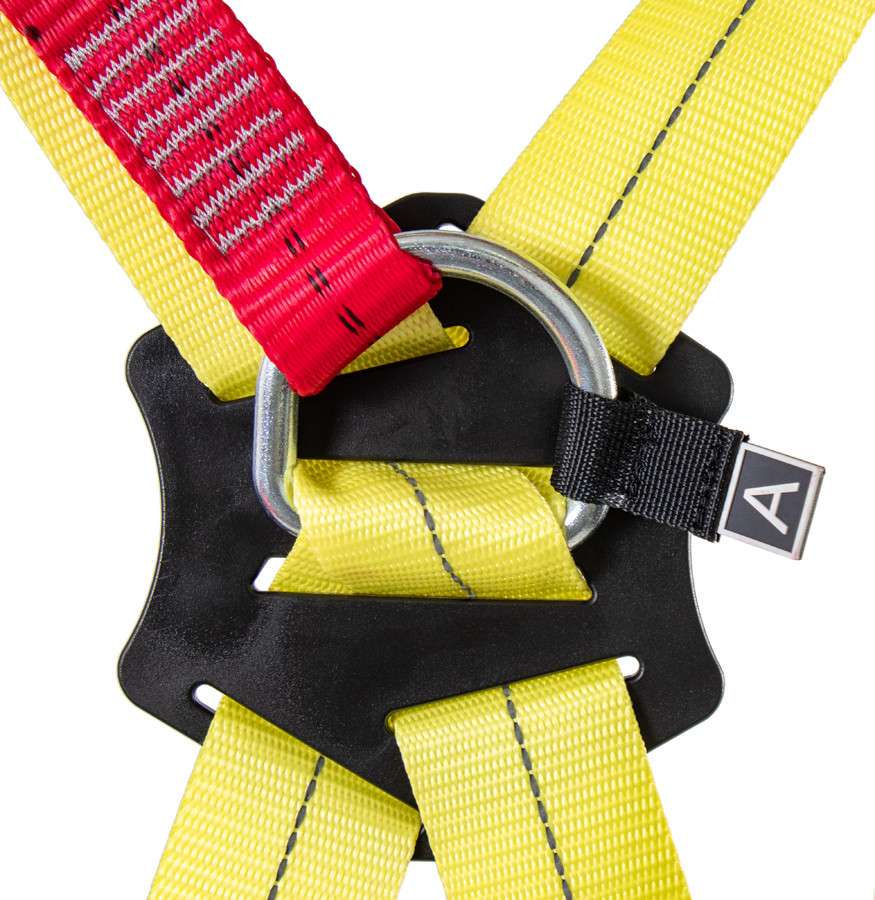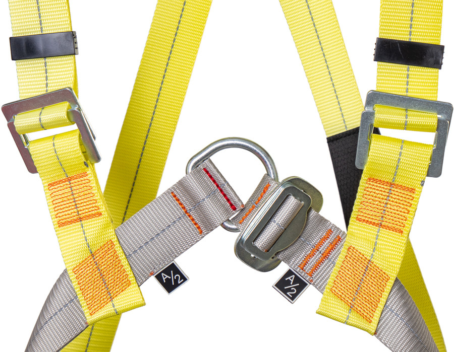 - точка крепления на спине, расположенная на Х-образных плечевых лямках, регулируется по высоте для правильного расположения и обеспечения максимального уровня безопасности при остановке падения;