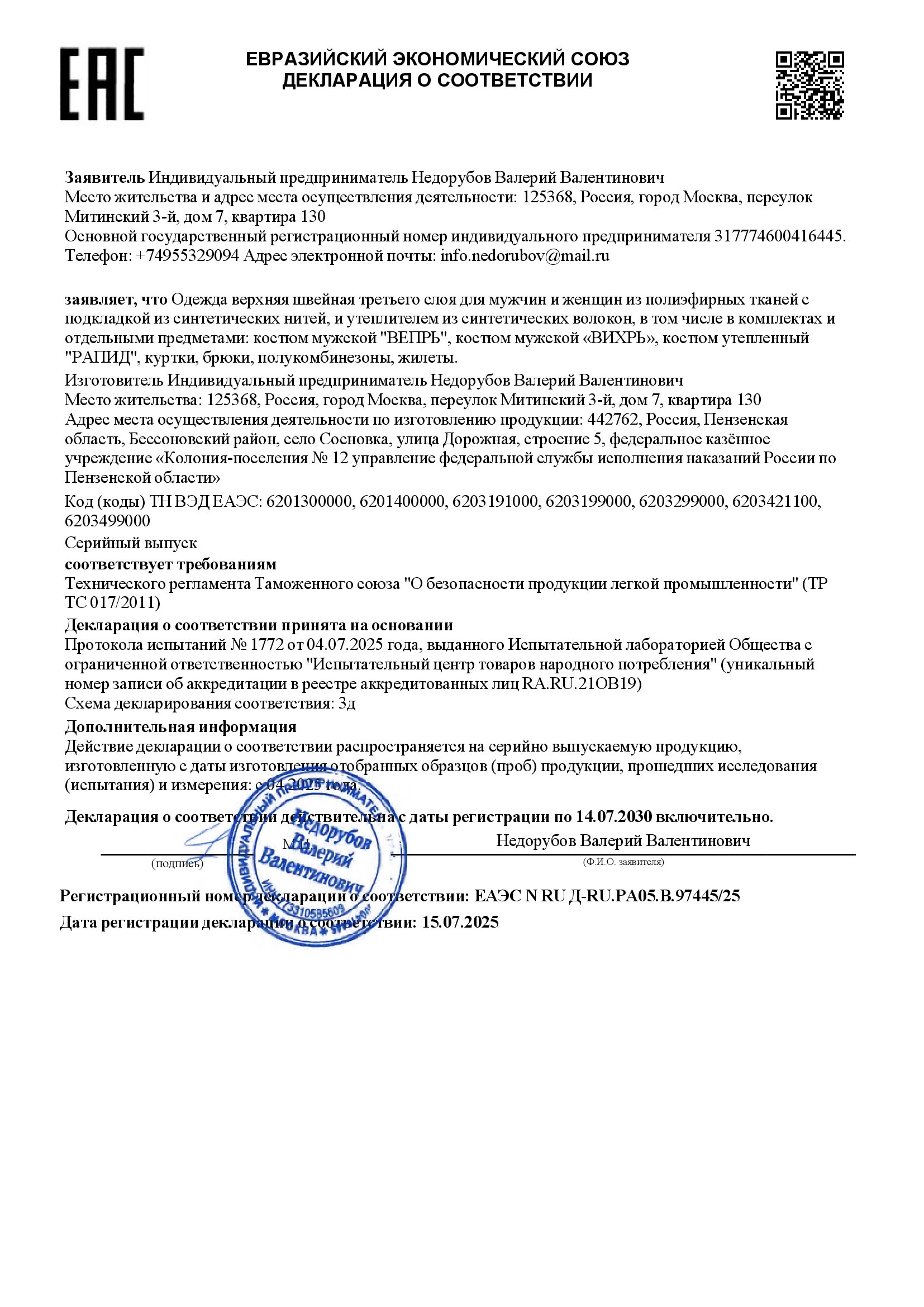 - Декларация о соответствии №ЕАЭС N RU Д-RU.РА05.В.97445/25 с 15.07.2025 по 14.07.2030 - 1 стр.