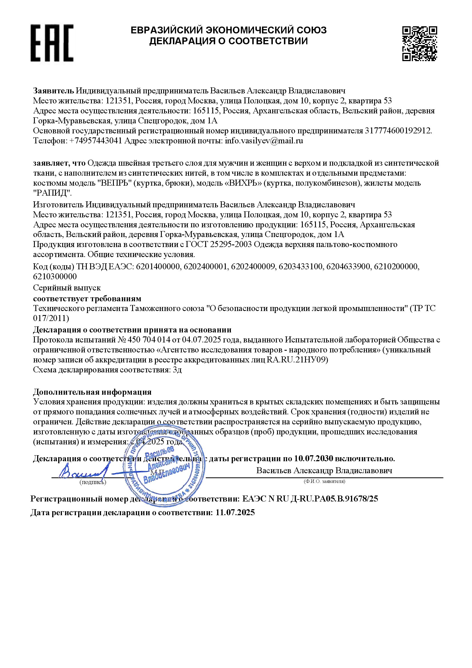 - Декларация о соответствии №ЕАЭС N RU Д-RU.РА05.В.91678/25 с 11.07.2025 по 10.07.2030 - 1 стр.