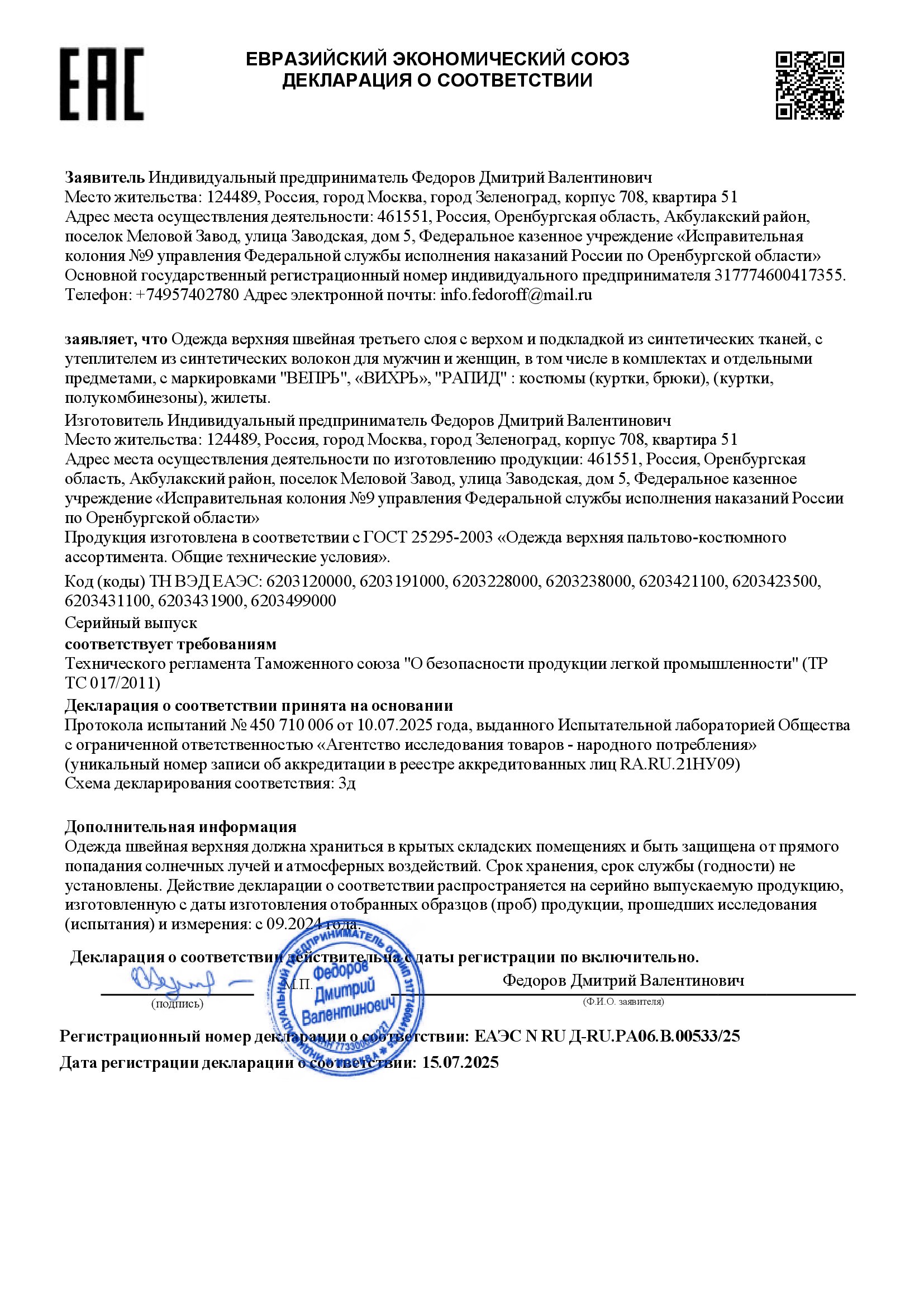 - Декларация о соответствии №ЕАЭС N RU Д-RU.РА06.В.00533/25 с 15.07.2025 по 14.07.2030 - 1 стр.