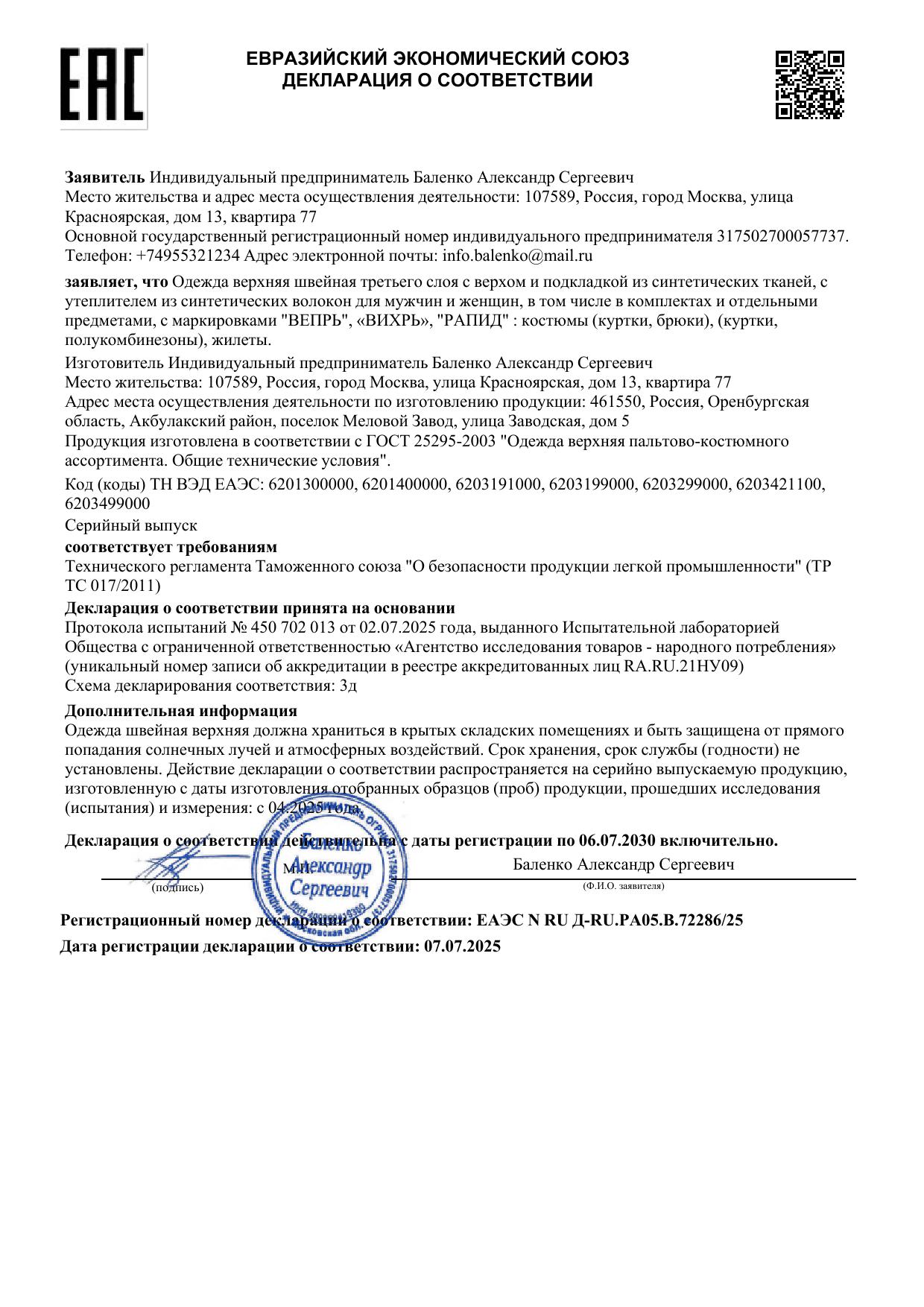 - Декларация о соответствии №ЕАЭС N RU Д-RU.РА05.В.72286/25 с 07.07.2025 по 06.07.2030 - 1 стр.