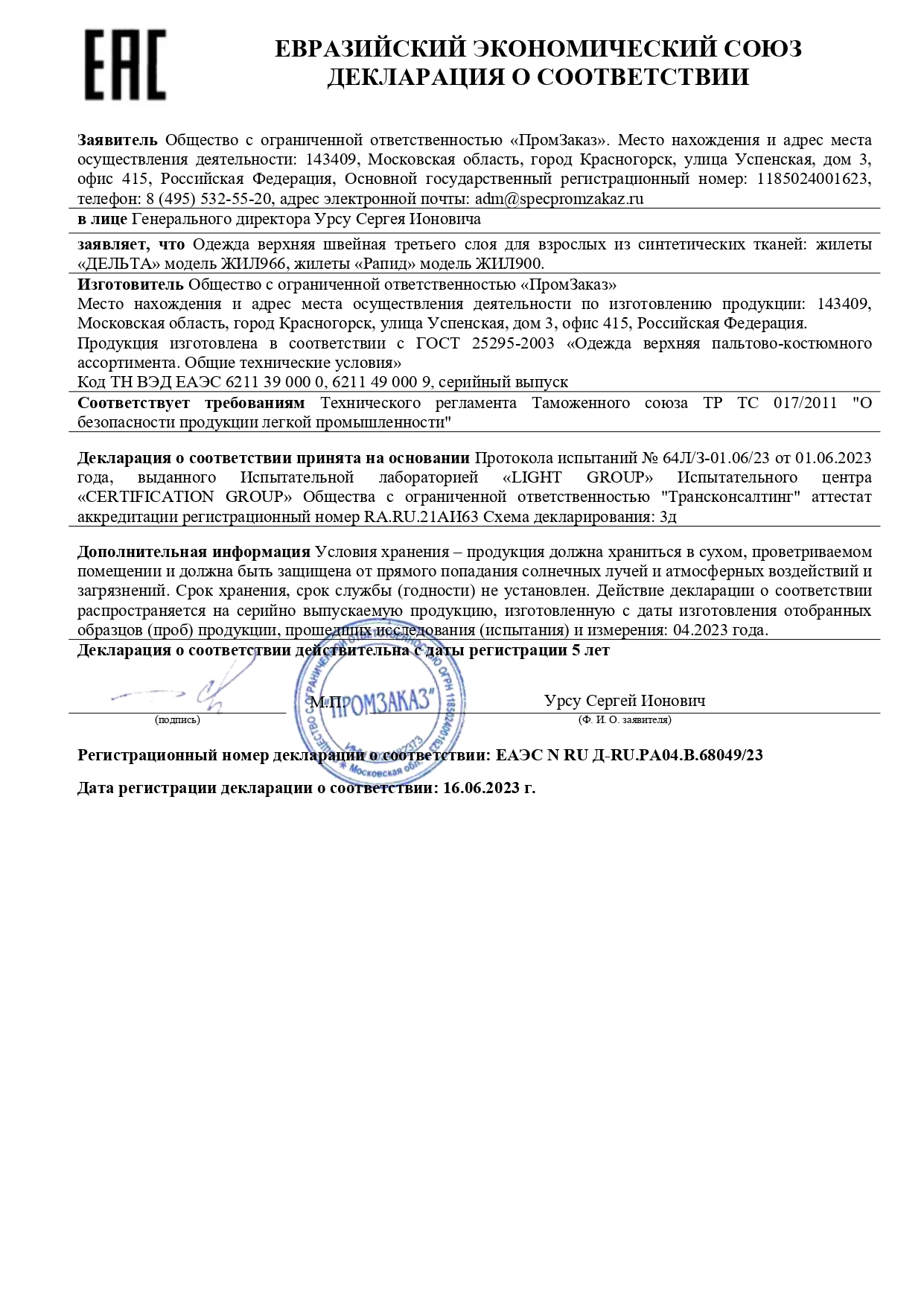 - Декларация о соответствии №ЕАЭС N RU Д-RU.РА04.В.68049/23 с 16.06.2023 по 14.06.2028 - 1 стр.