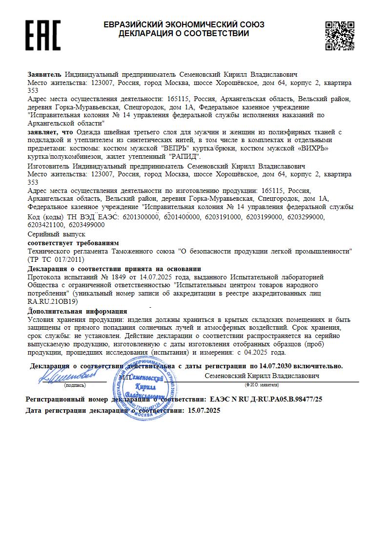 - Декларация о соответствии №ЕАЭС N RU Д-RU.РА05.В.98477/25 с 15.07.2025 по 14.07.2030 - 1 стр.